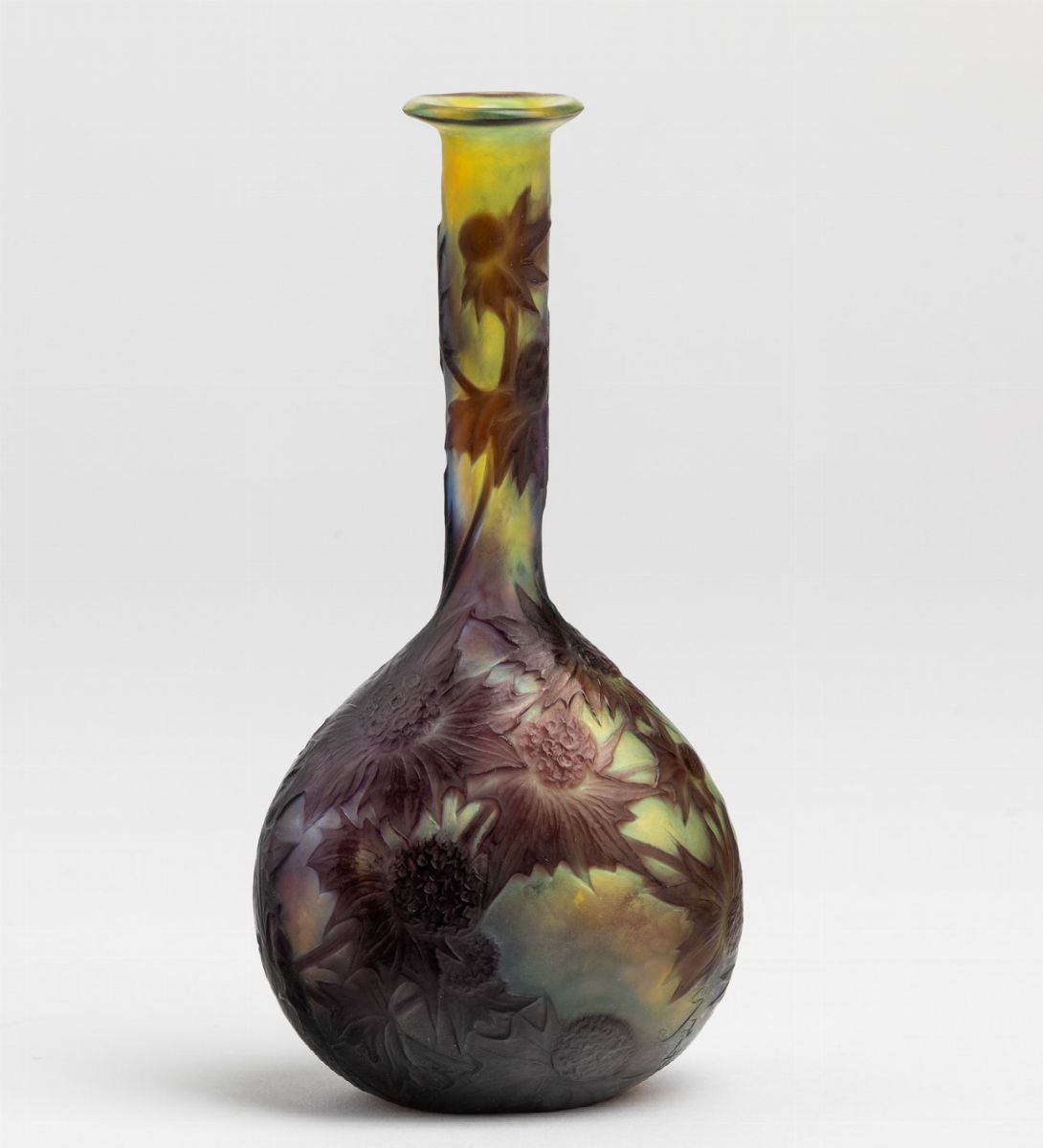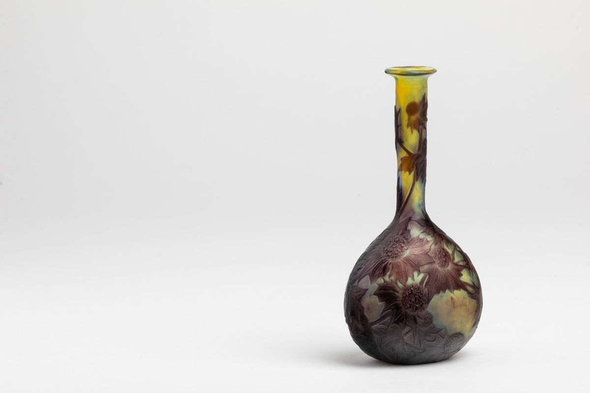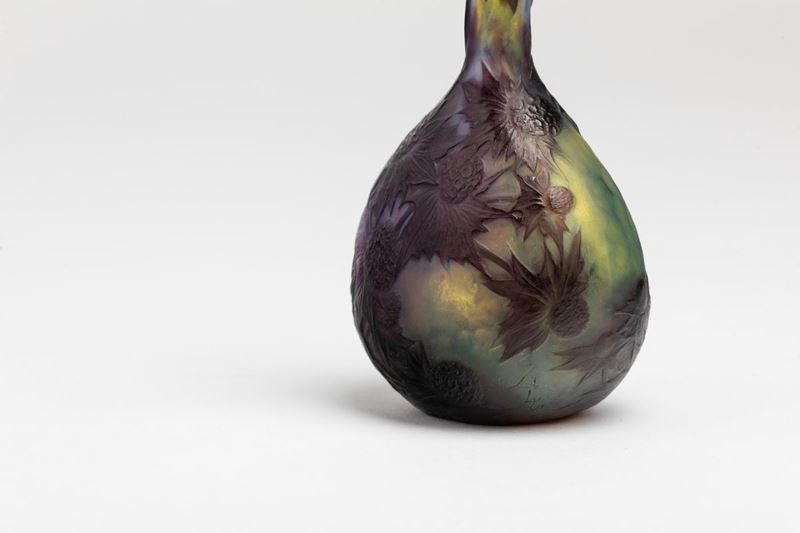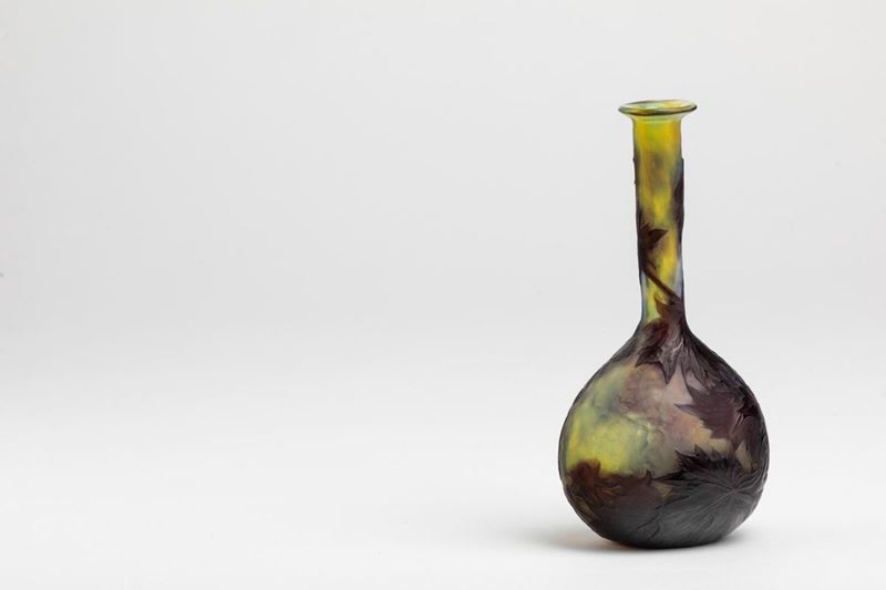 Vaso a mandolino in vetro a cammeo con decoro floreale. Superficie interamente lavorata alla mola, a lavorazione martellata.