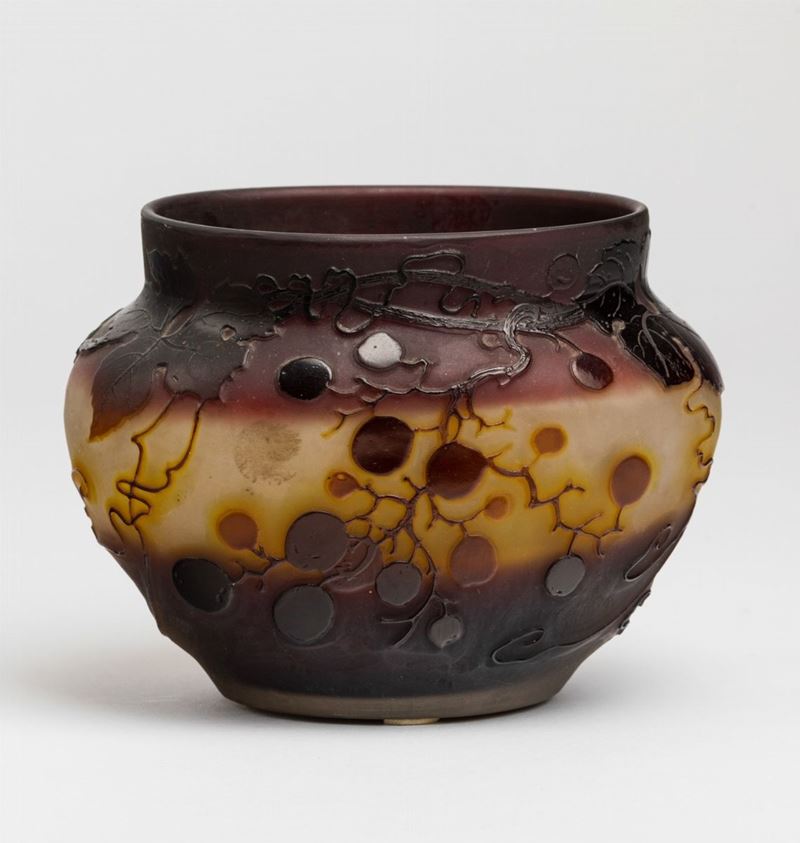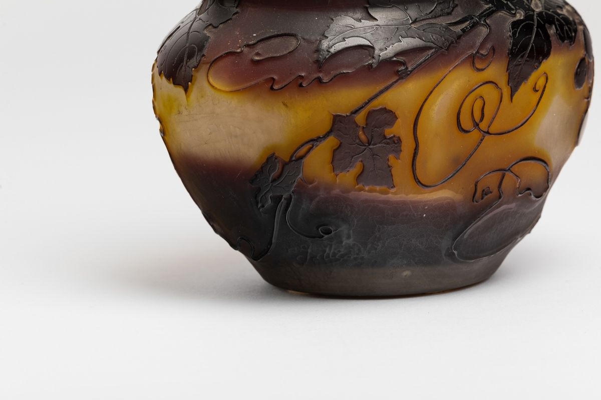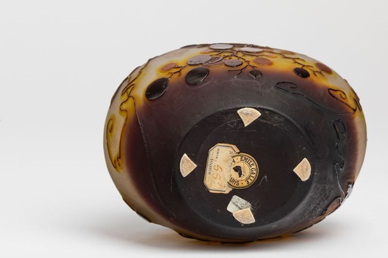 Vaso ovale in vetro a cammeo con decoro di rami con foglie. Firma a rilievo e vecchia etichetta cartacea della manifattura