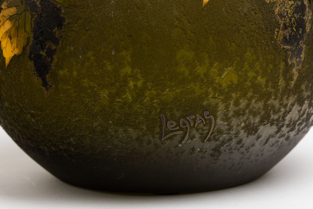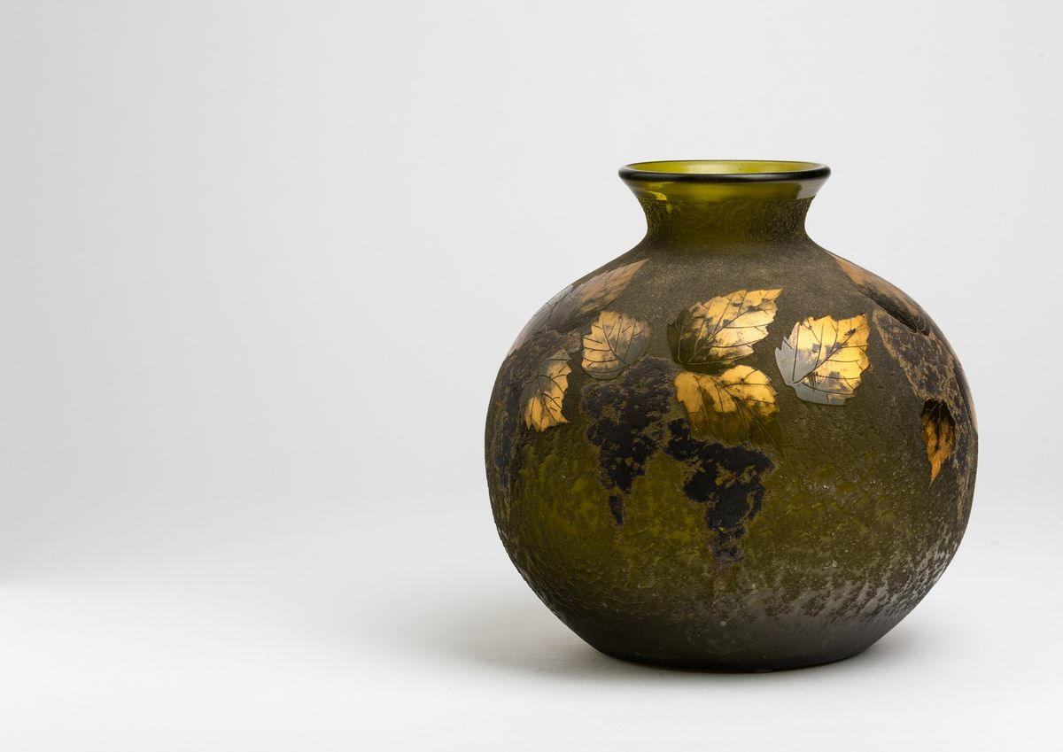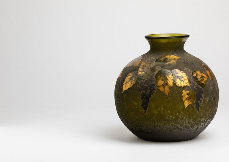 Vaso a sfera con collo svasato in vetro a cammeo con decoro di foglie e dorature. Superficie lavorata alla mola. Firma a rilievo