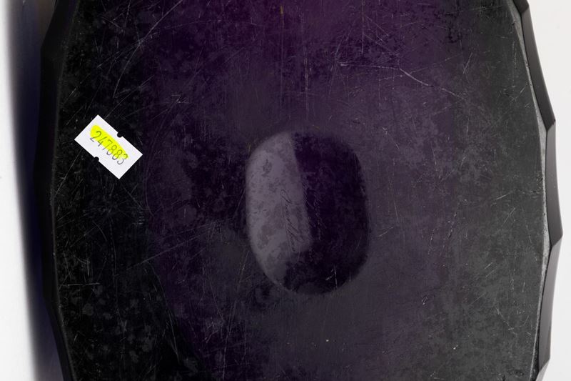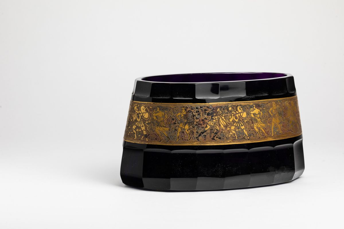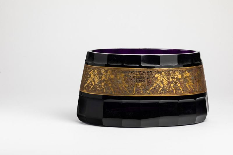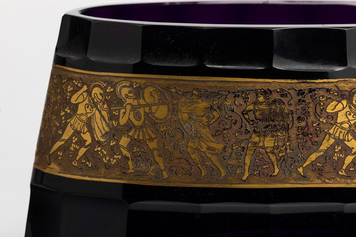 Grande vaso ovale in cristallo sfaccettato con fregio a cammeo con fascia in vetro raffigurante scena classica a cammeo con dorate.