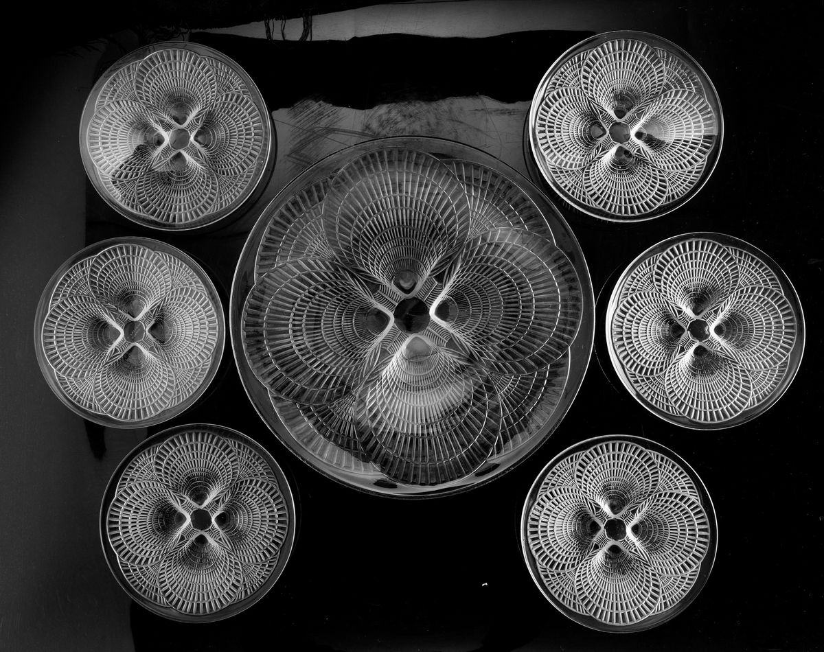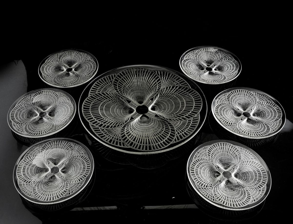 Lotto composto da alzatina in vetro stampato Coquillage e sei piattini dal diametro di 16,5 cm
