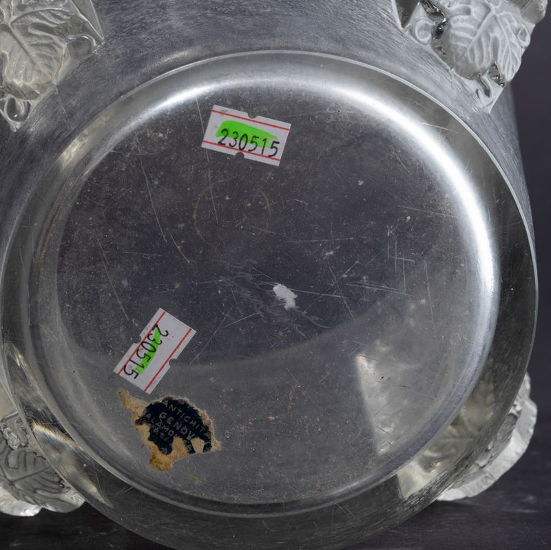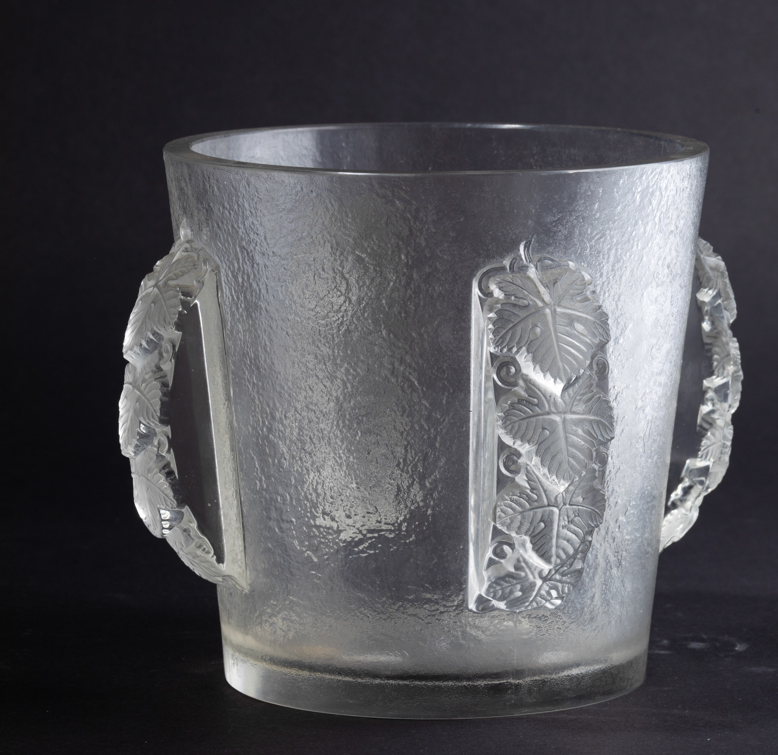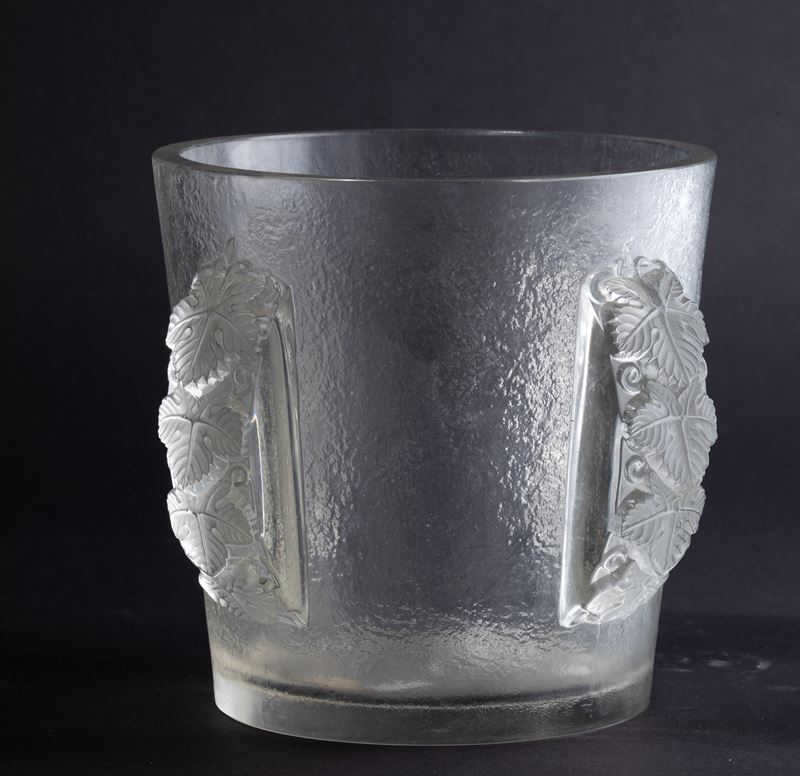 Vaso troncoconico in vetro stampato con decoro di foglie applicato sui manici.