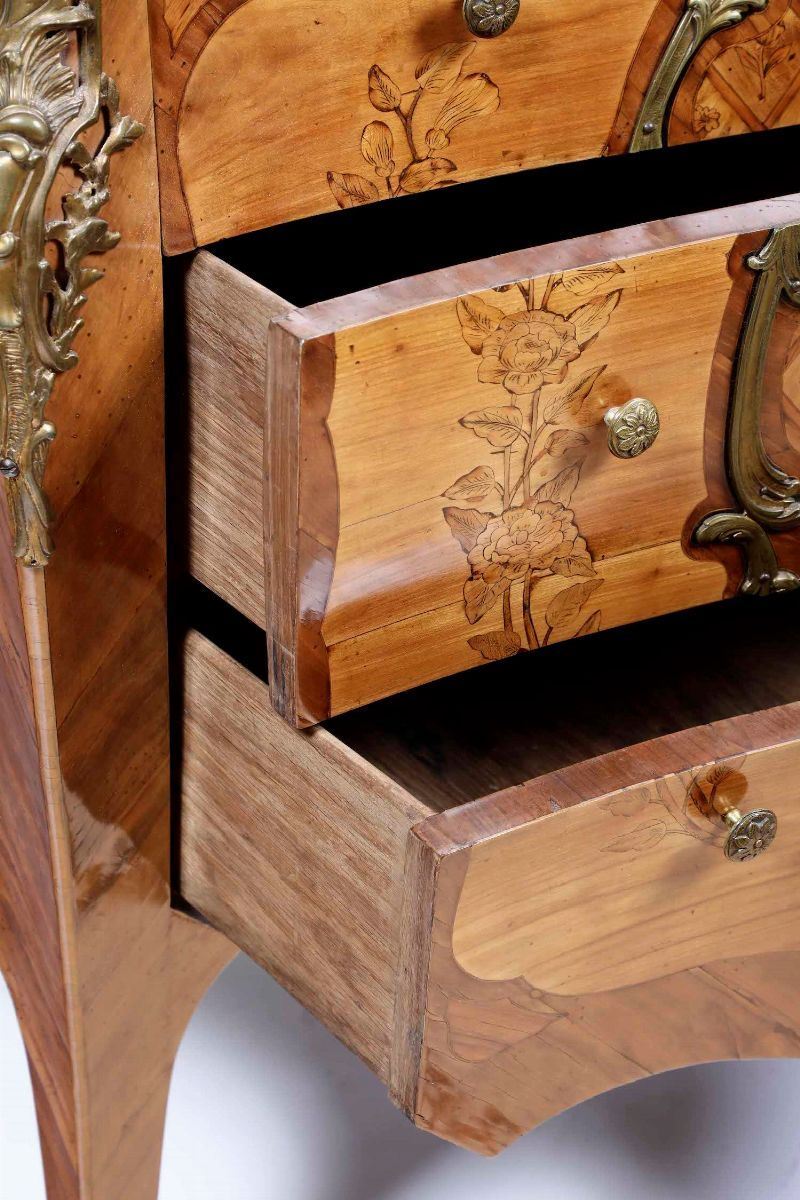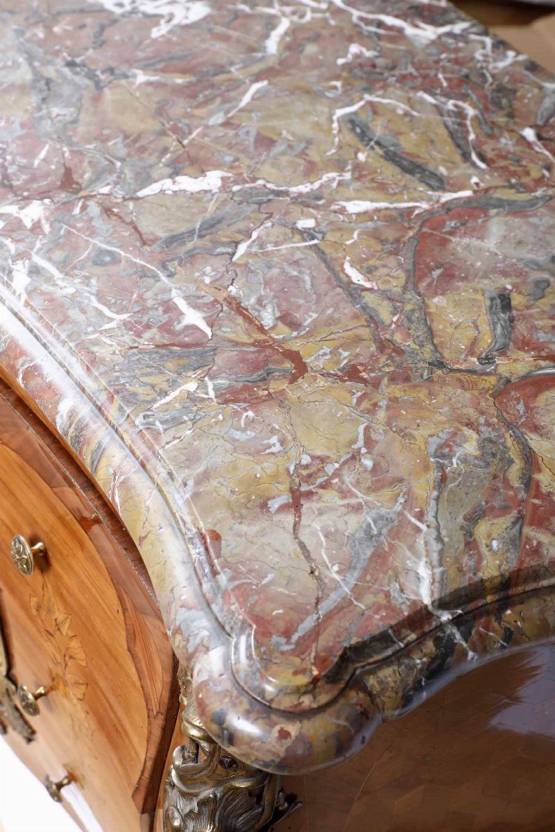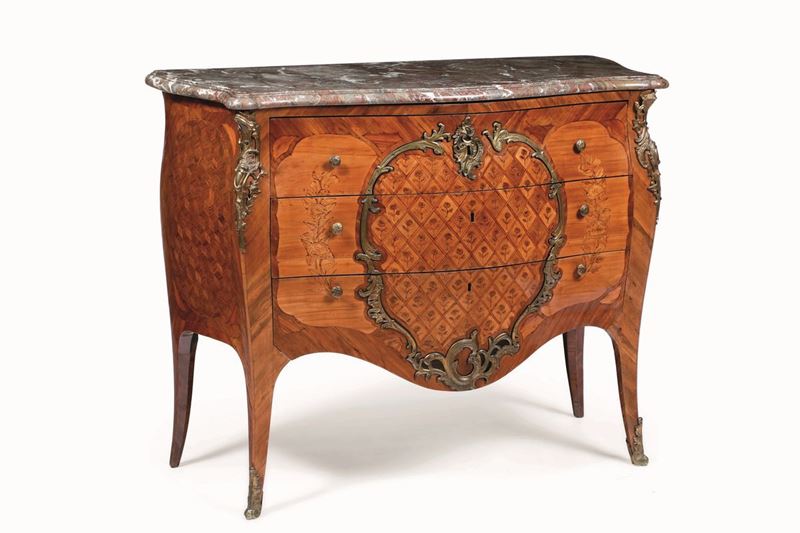 Fronte bombato a tre cassetti decorati ad intarsio con motivi floreali, impreziosito da riserva centrale in bronzo dorato. Fianchi mossi a marqueterie, applicazioni e scarpette in bonzo dorato. Piano sagomato in marmo.