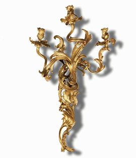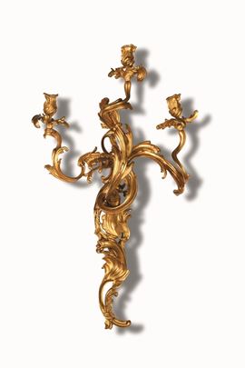 Coppia di appliques a tre fiamme in bronzo fuso, cesellato e dorato. XVIII secolo