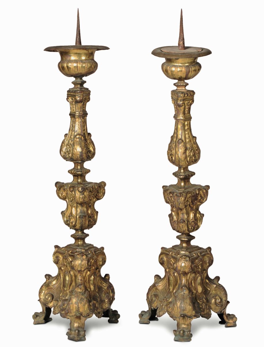 Coppia di candelieri in rame dorato. XVIII secolo