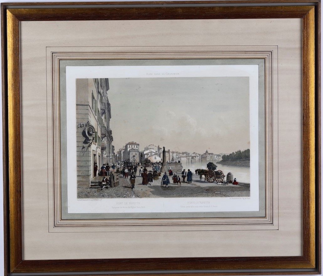 Raffiguranti vedute di Roma: il porto di Ripetta, oggi perduto per via della costruzione degli argini sul Tevere, e il porto di Ripa Grande.