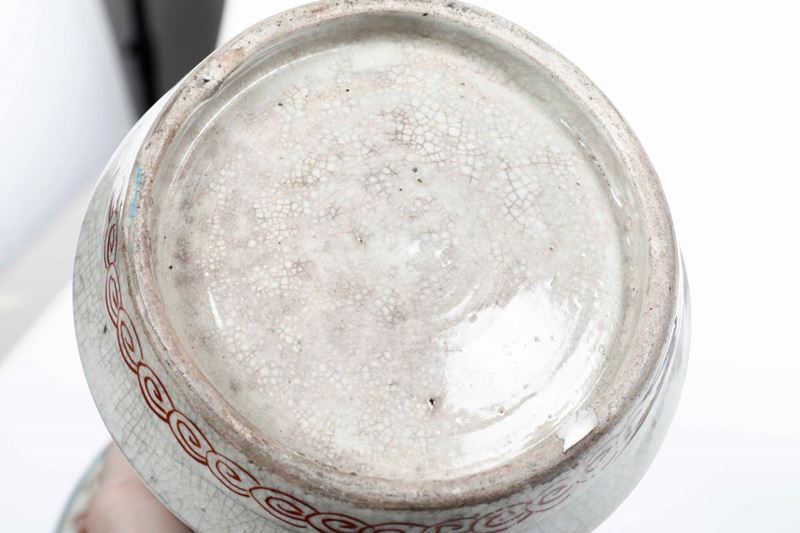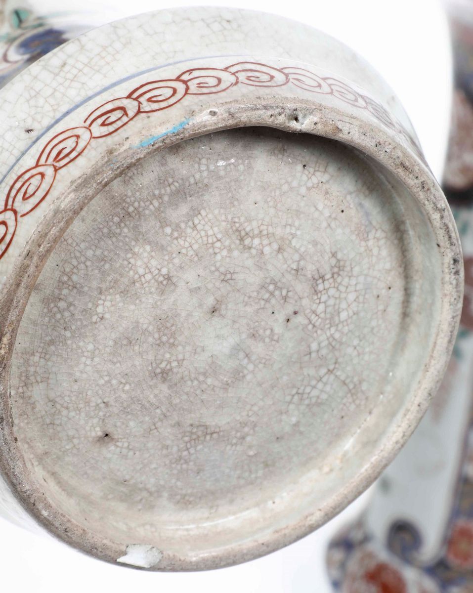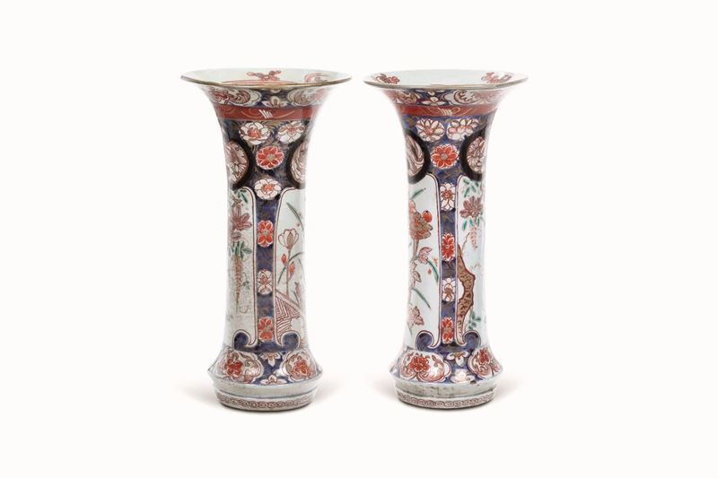 Coppia di vasi a tromba in porcellana Imari con scene naturalistiche entro riserve e decori floreali. Giappone, XVIII-XIX [..]