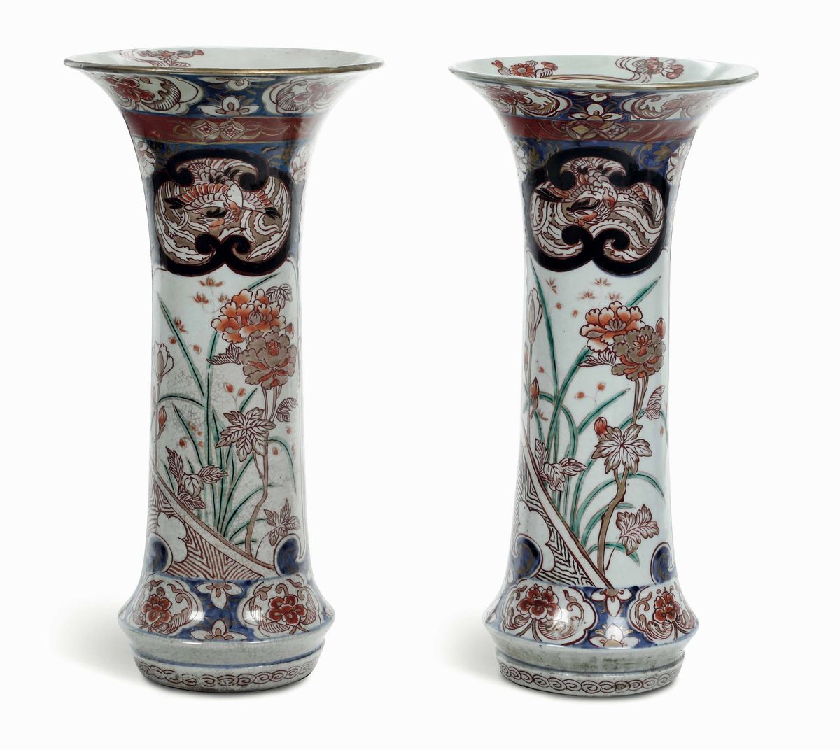Coppia di vasi a tromba in porcellana Imari con scene naturalistiche entro riserve e decori floreali. Giappone, XVIII-XIX secolo