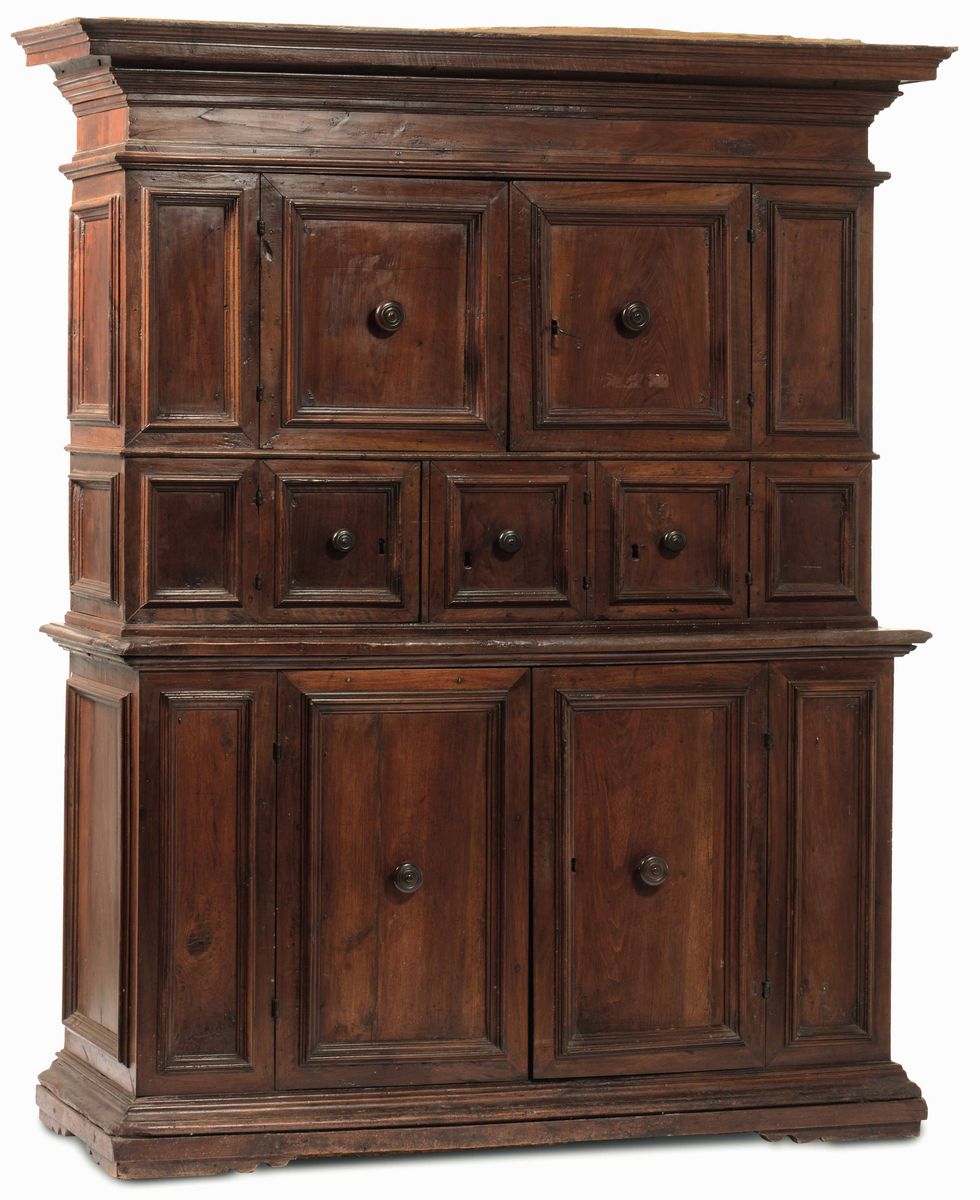 Credenza a doppio corpo in noce. Italia centrale, XVII secolo