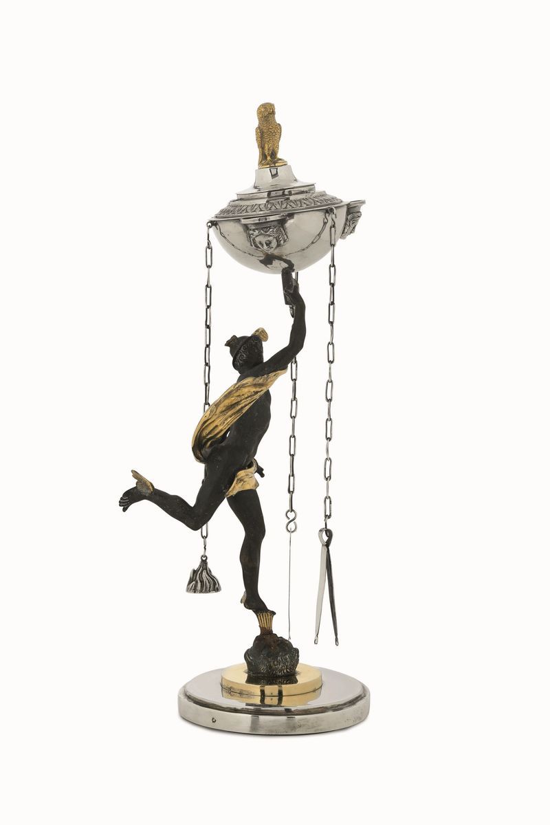 Lucerna con Ermes. Argento fuso, sbalzato, cesellato e bronzo fuso, patinato e dorato. Roma metà del XIX secolo. Argentiere [..]