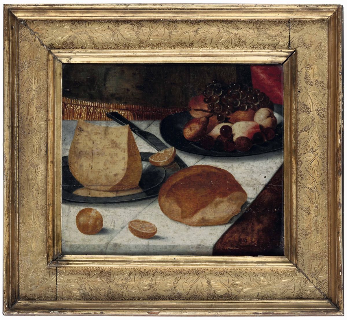 Natura morta con pane, frutta e formaggio