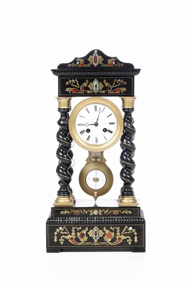 Lastronata in legno ebanizzato e filettata in ottone. Montanti a colonne a torciglioni, quadrante a numeri romani per le ore