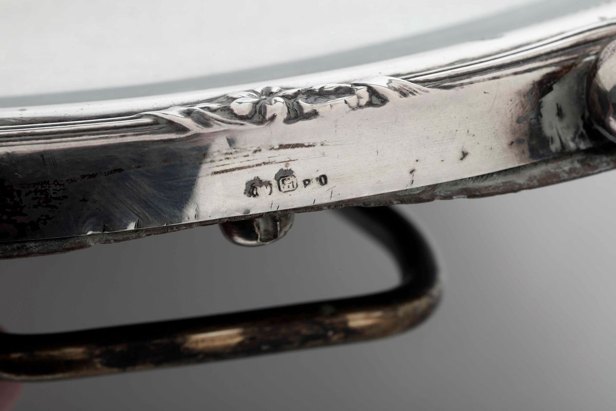Specchio ovale con cornice in argento sormontata da fiocco. Italia, XX secolo