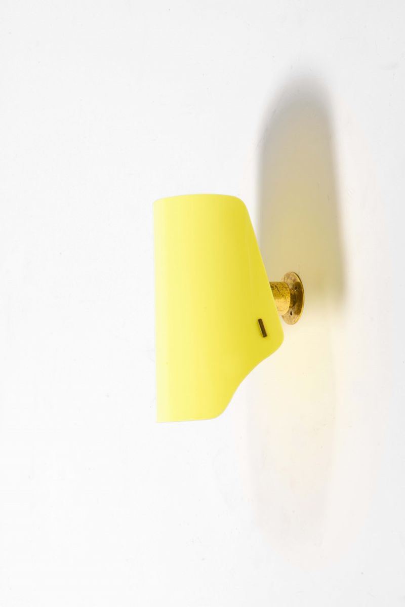 Lampada da parete con struttura in ottone e paralume in acrilico.