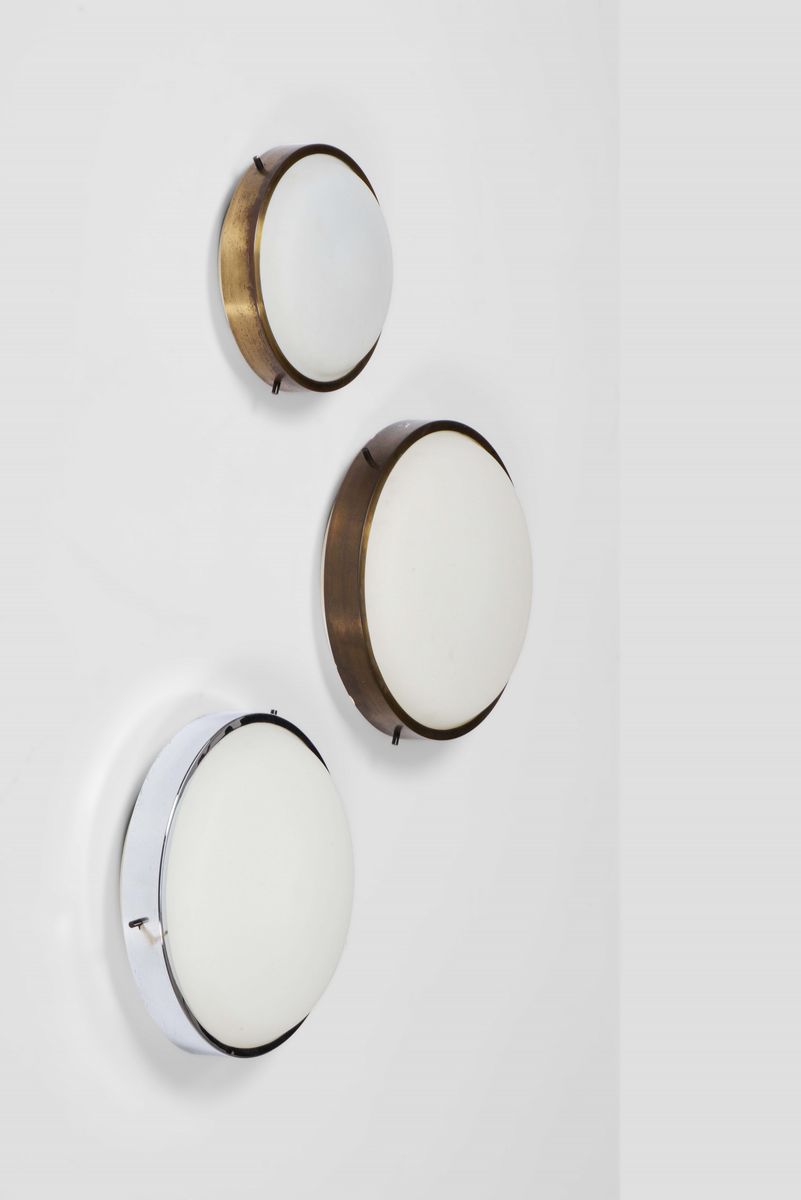 Tre lampade mod.597 a plafone con struttura in ottone e ottone nichelato.