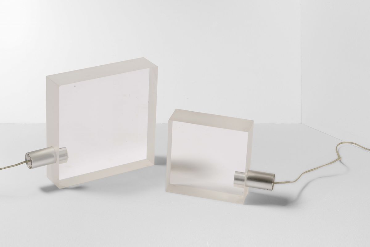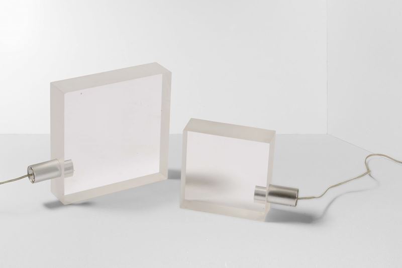 Due lampade mod. TōFU lamp con struttura in metacrilato trasparente e alluminio.