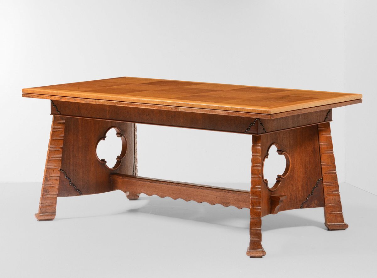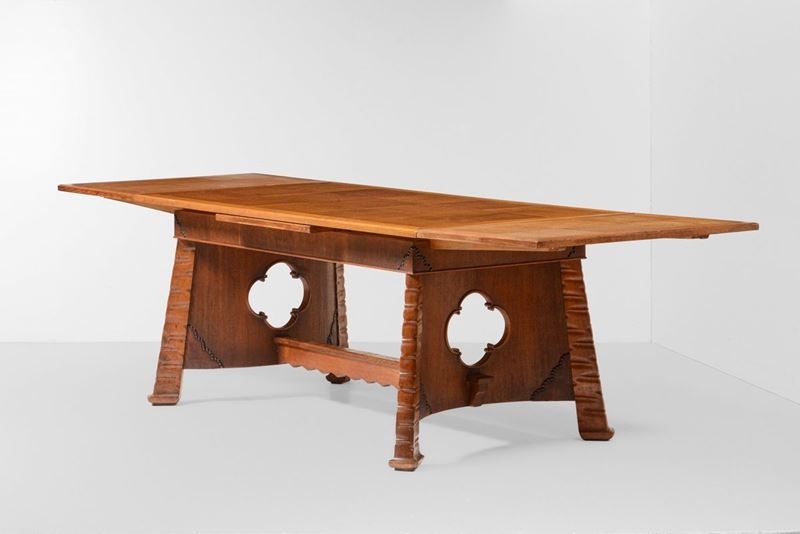 Tavolo allungabile. Struttura in legno e legno scolpito, piano in legno impiallacciato a configurazione geometrica.