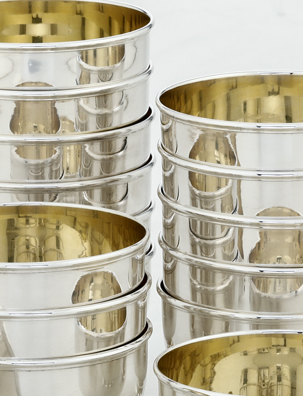 composto da: Piatti di portata argento: 1 x tondo diametro 35 cm 1 x ovale lunghezza 45 cm 1 x ovale lunghezza 70 cm 6 x scodelline per lavare frutta argento 4 x piattini porta pane o sottobottiglie rotondi 2 x sotto bottiglie (piu' profondi) argento [..]
