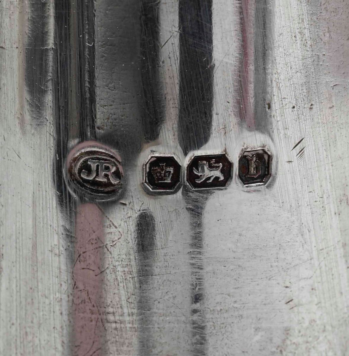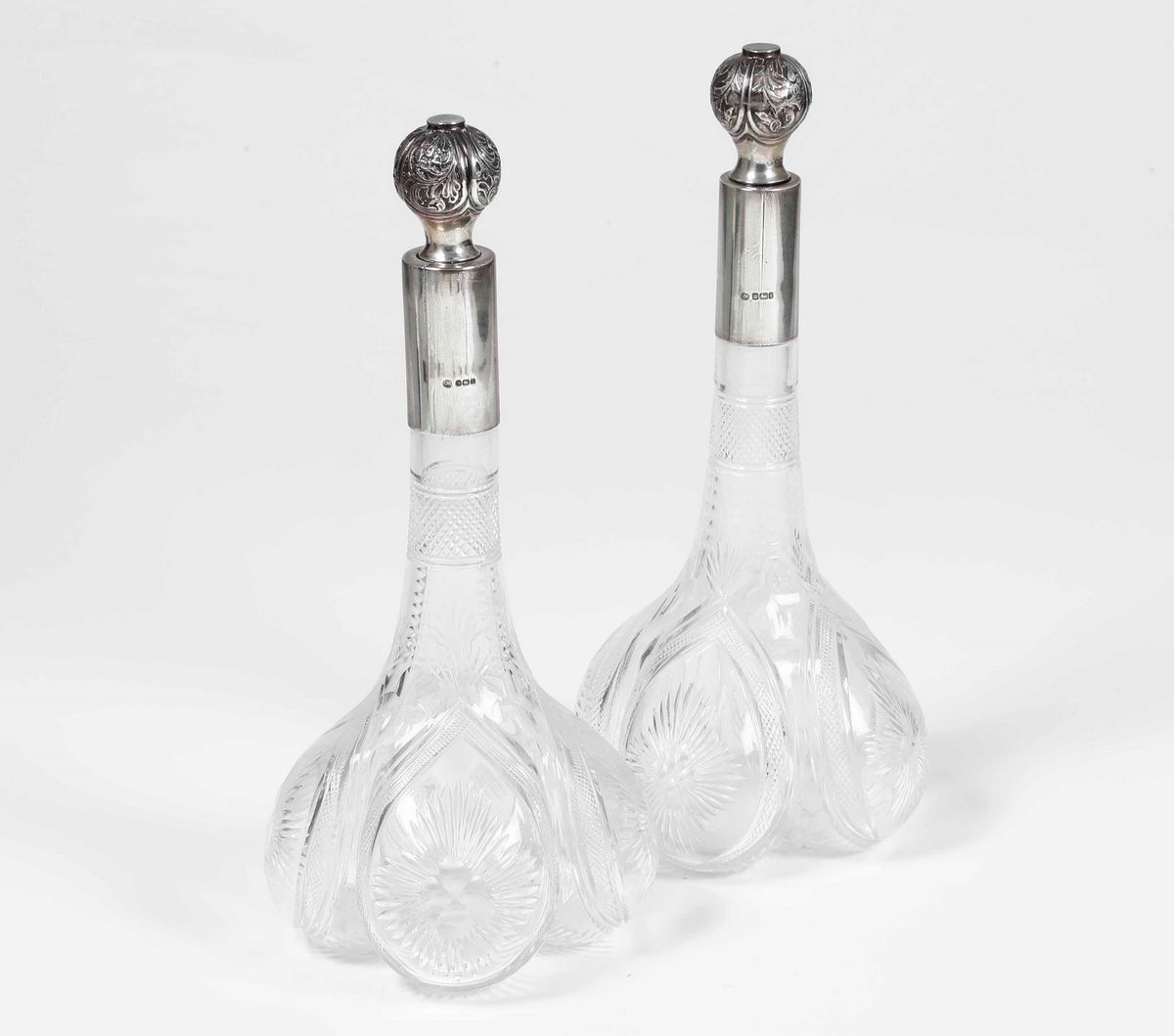 Coppia di bottiglie quadrilobate in vetro molato e finiture in argento.