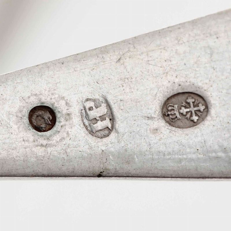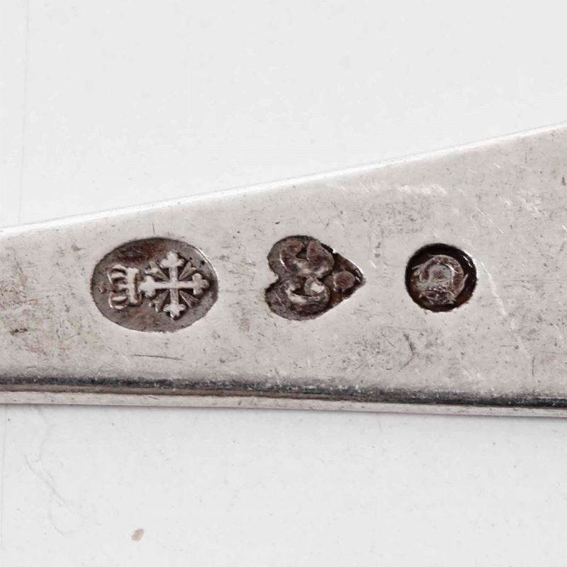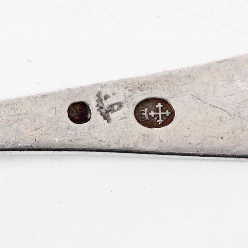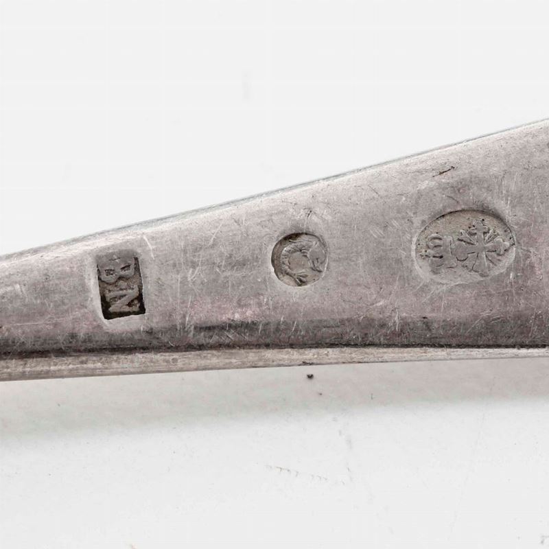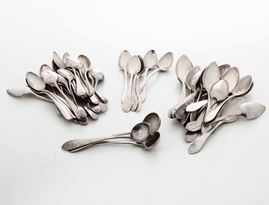 Insieme composto da 21 cucchiaini medi, 24 cucchiaini piccoli, 6 cucchiaini piccoli lisci e tre cucchiaini a mestolo in argento, XIX-XX secolo