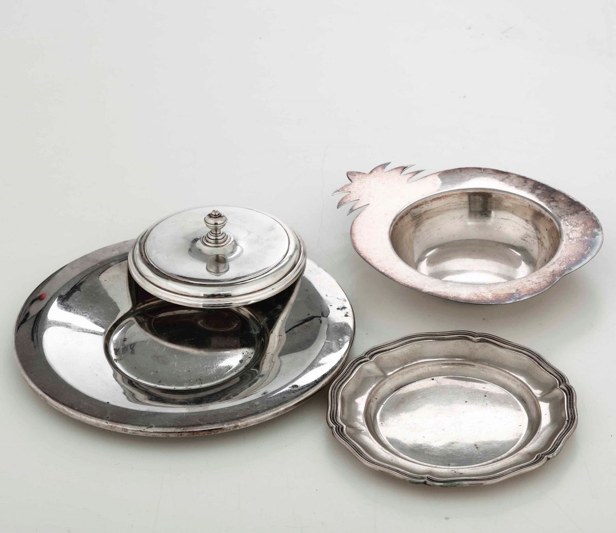 Lotto composto da piattino circolare, coperchio, piatto circolare e piattino ananas in argento. Varie manifatture italiane del XX secolo