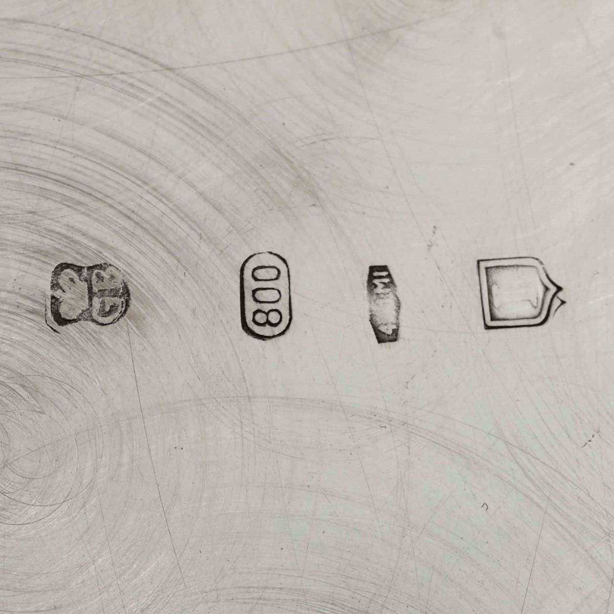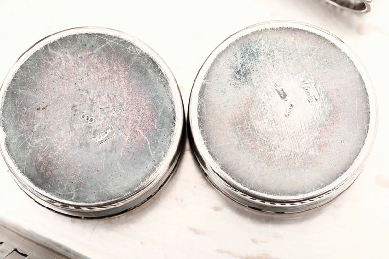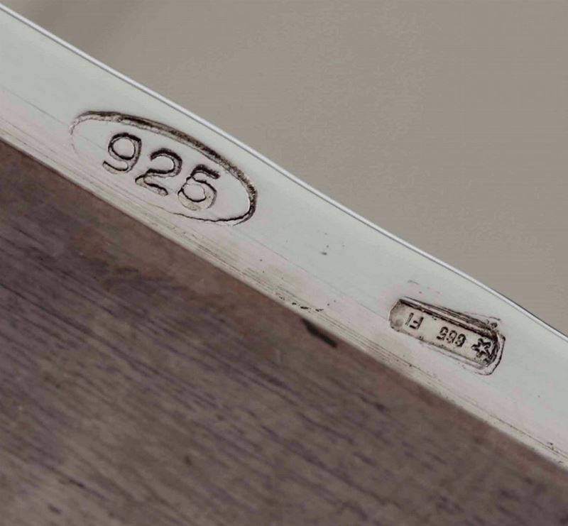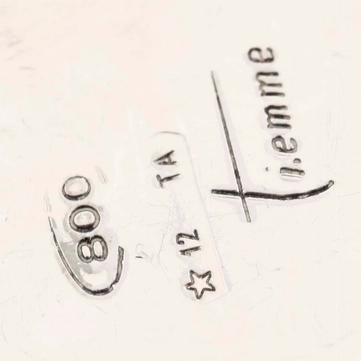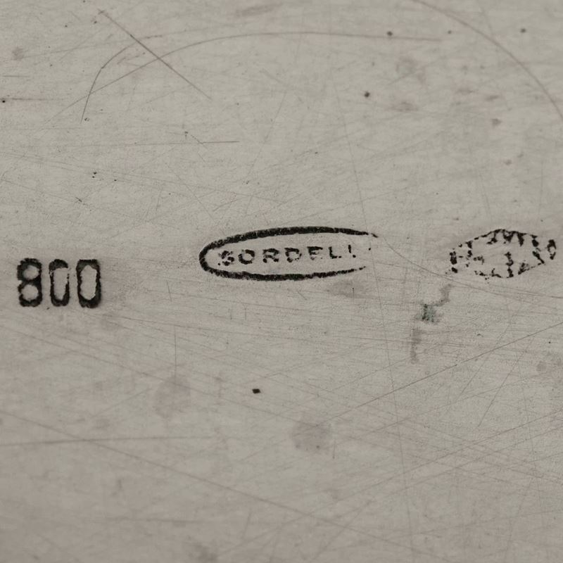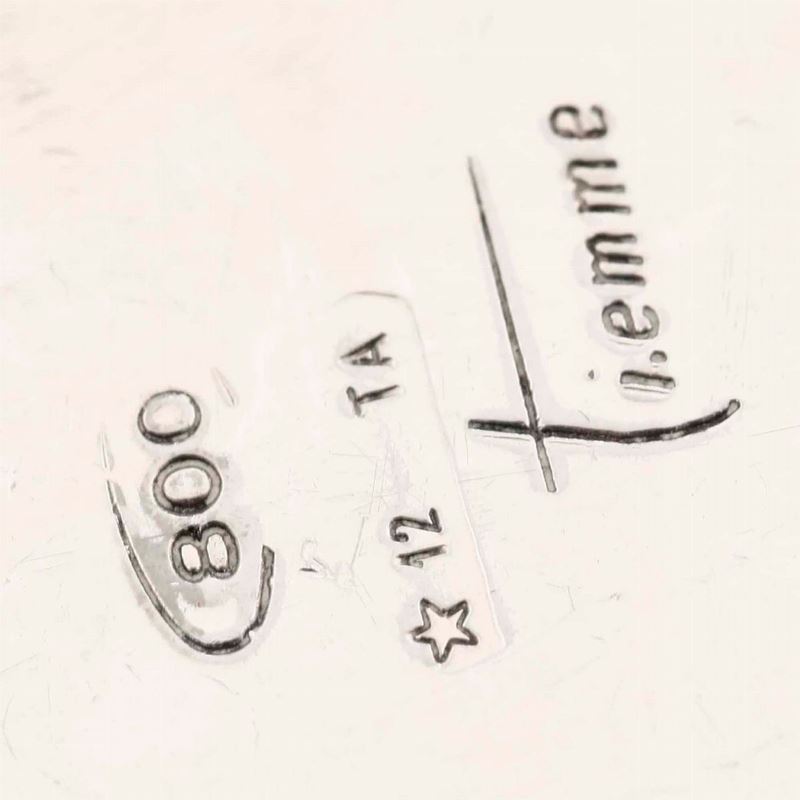 composto da: Piatti di portata argento: 1 x tondo diametro 35 cm 1 x ovale lunghezza 45 cm 1 x ovale lunghezza 70 cm 6 x scodelline per lavare frutta argento 4 x piattini porta pane o sottobottiglie rotondi 2 x sotto bottiglie (piu' profondi) argento tondi 1 x cestino ovale argento 1 x vassoietto rettangolare argento 1 x scatola sigarette ricamata argent 1 x scatola sigarette con monetina San Marino 1938 1 x alzatina ricamata