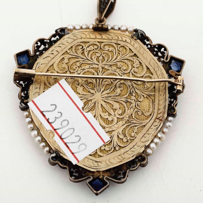 Spilla con montatura in oro 18K, perline naturali, pietre colorate e smalti. Oreficeria del XX secolo