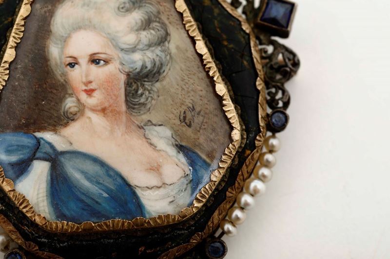 Al centro miniatura con volto di gentildonna firmata con monogramma EM