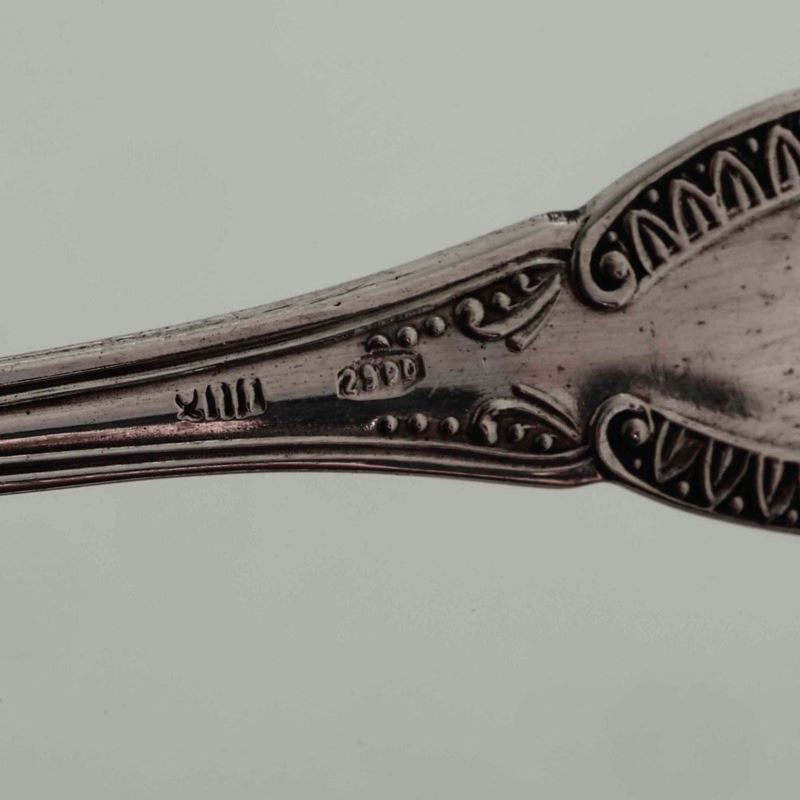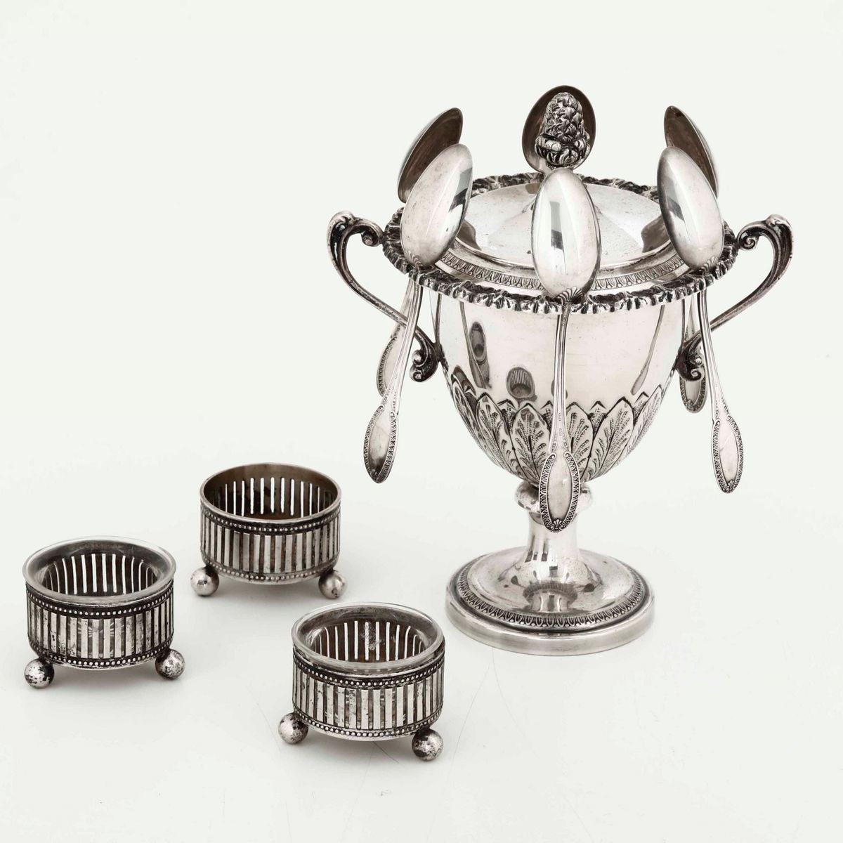 Zuccheriera con sei cucchiaini in argento e tre saliere antiche (mancanze), vari argentieri, Italia e Francia XX secolo