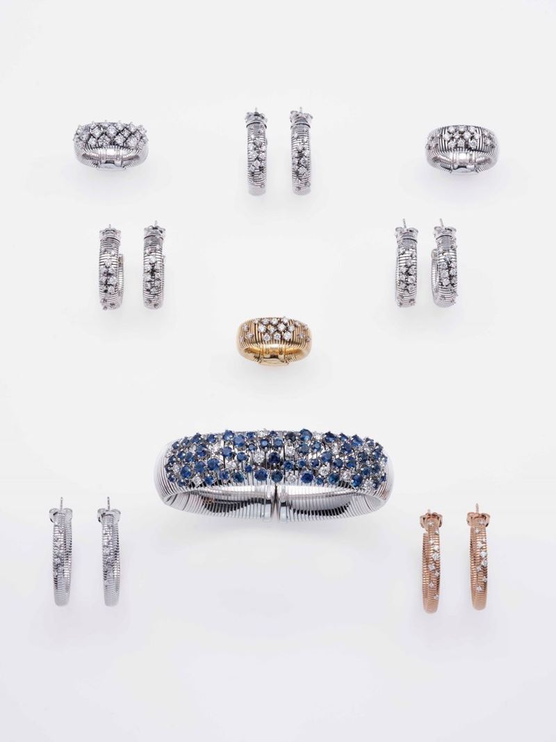 Modello Stardust. Lotto composto da tre anelli, cinque paia di orecchini ed un bracciale con diamanti e zaffiri