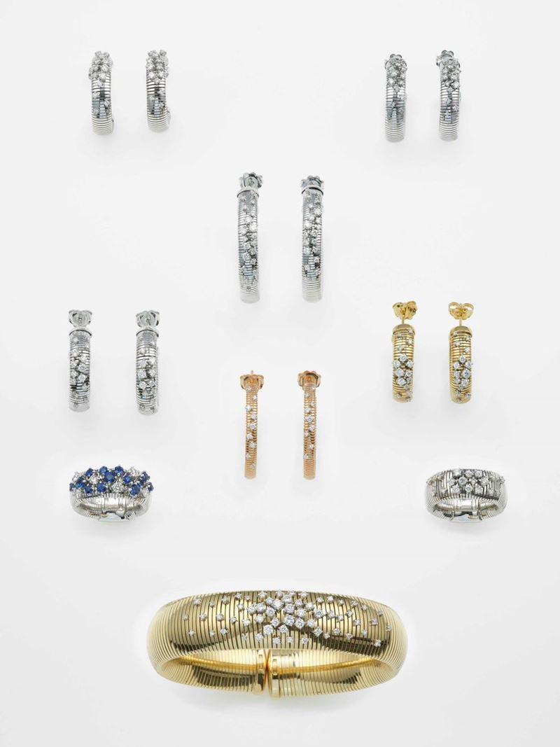 Modello Stardust. Lotto composto da un bracciale, sei paia di orecchini e due anelli con diamanti e zaffiri