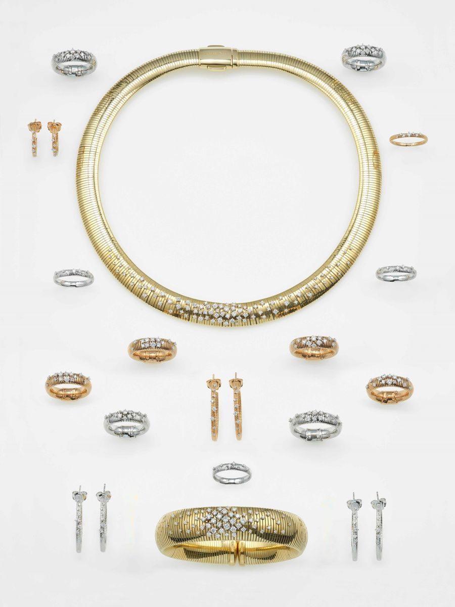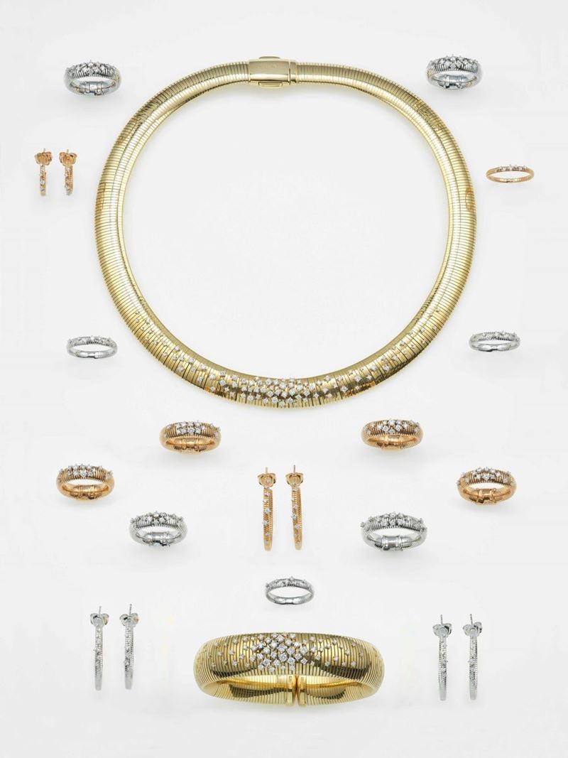 Modello Stardust. Lotto composto da un girocollo, dodici anelli, quattro paia di orecchini ed un bracciale con diamanti