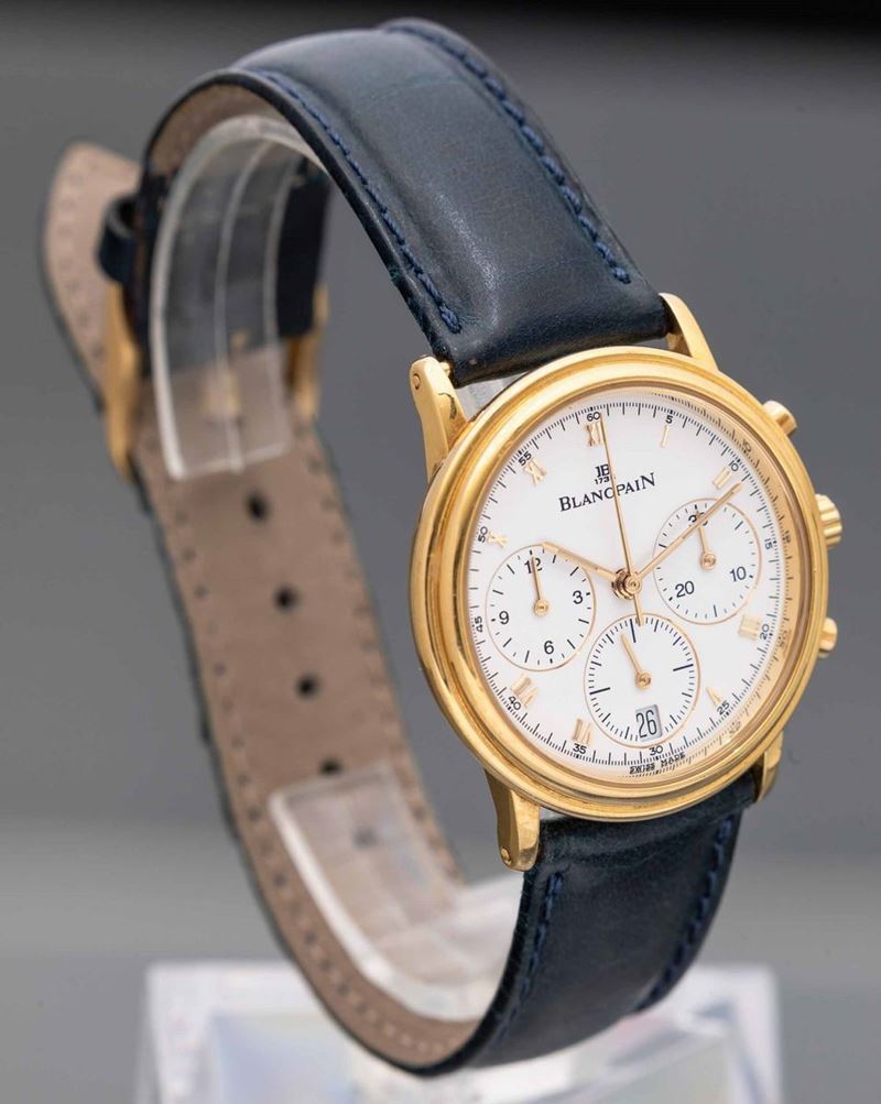 BLANCPAIN - Villaret in oro 18k cronografo automatico tre contatori con datario, quadrante bianco e numeri Romani
