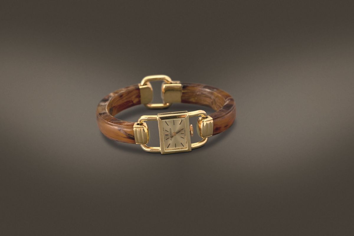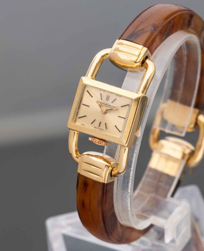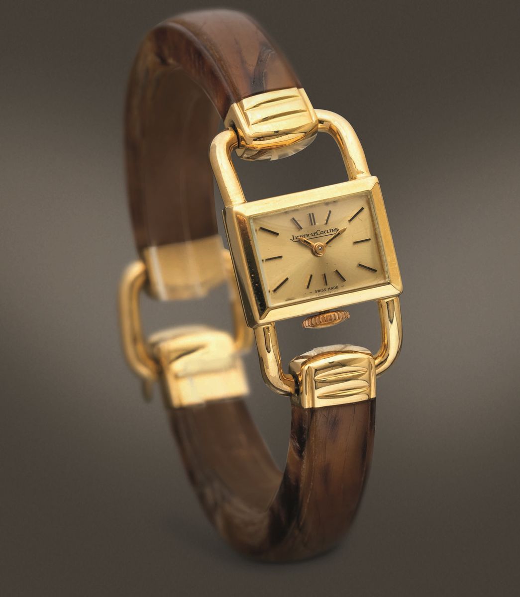 JAEGER LECOULTRE - Etrier in oro giallo 18k carica manuale con bracciale rigido effetto tartaruga anni '50