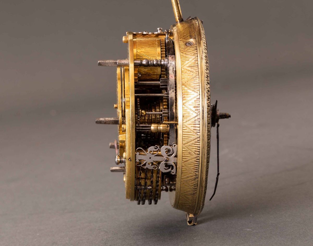 The rear platine is showing the signature of the watchmaker: “CABRIER”…. probably “Charles Cabrier”, second generation of the Cabrier family, active in London in the XVIII Cent.