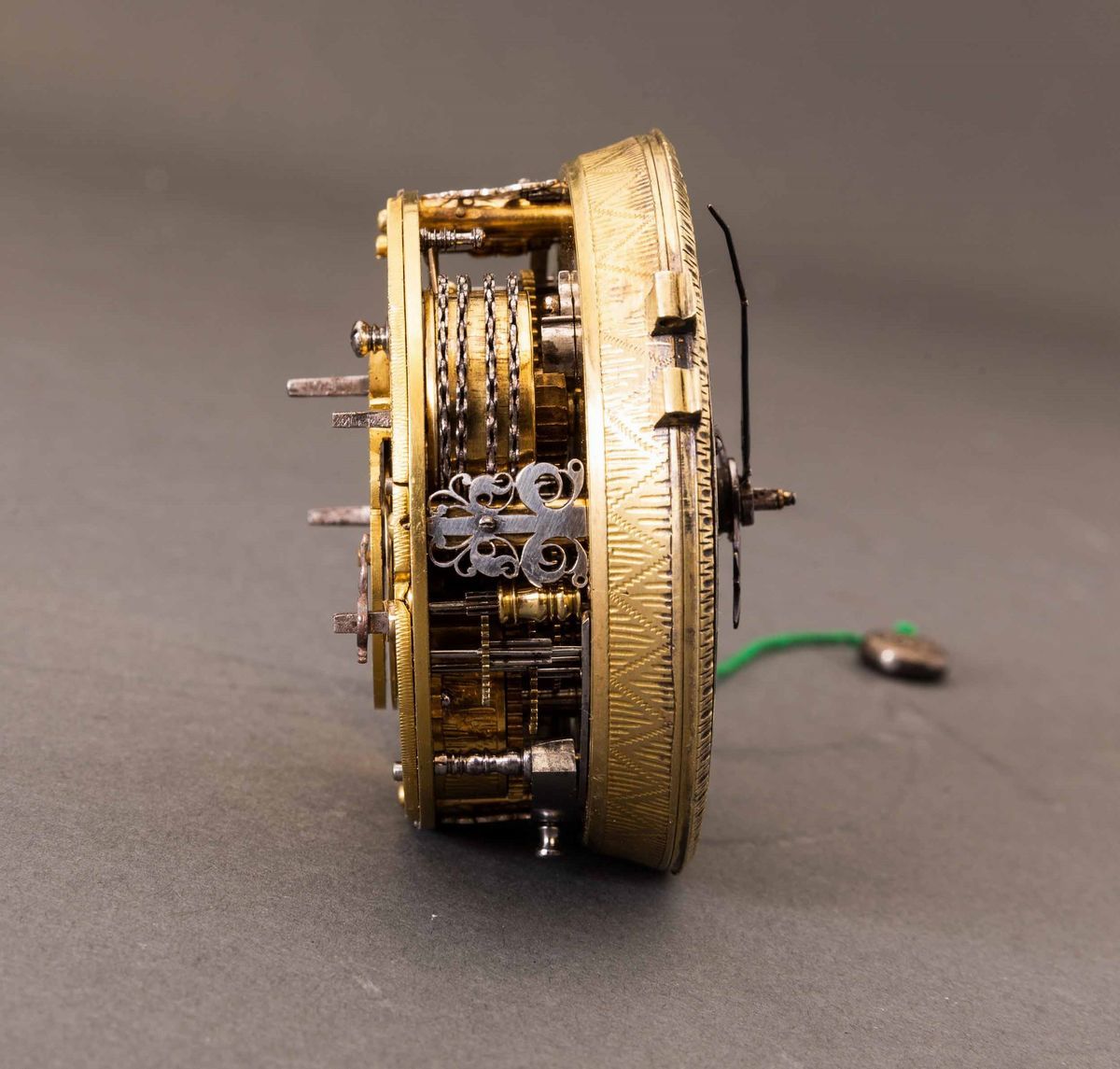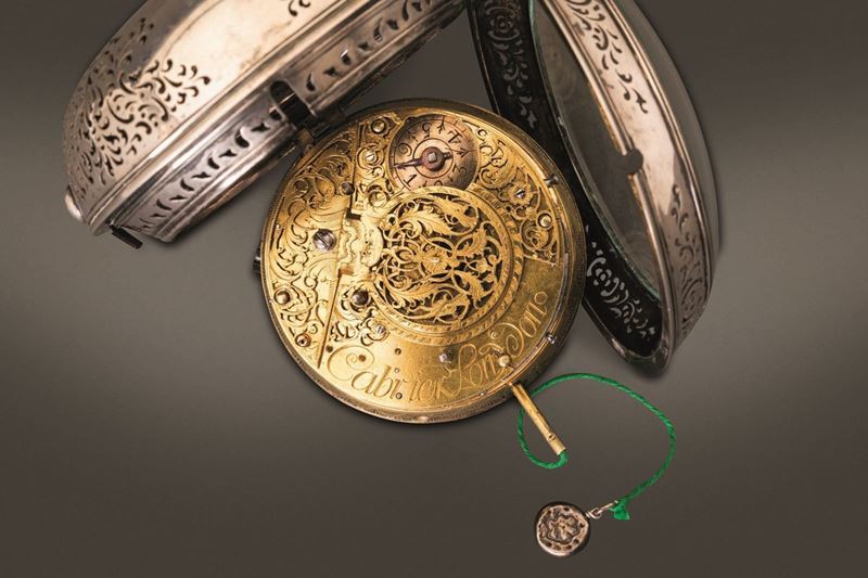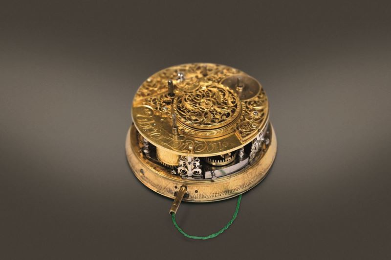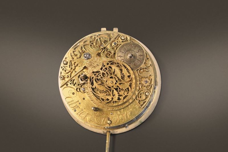 La platina posteriore, impreziosita da un coq di pregevole fattura, riporta la firma dell’autore: “Cabrier” : probabilmente si tratta di “Charles Cabrier”, seconda generazione di una famiglia di eccellenti orologiai attivi in Londra per tutto il XVIII Secolo.