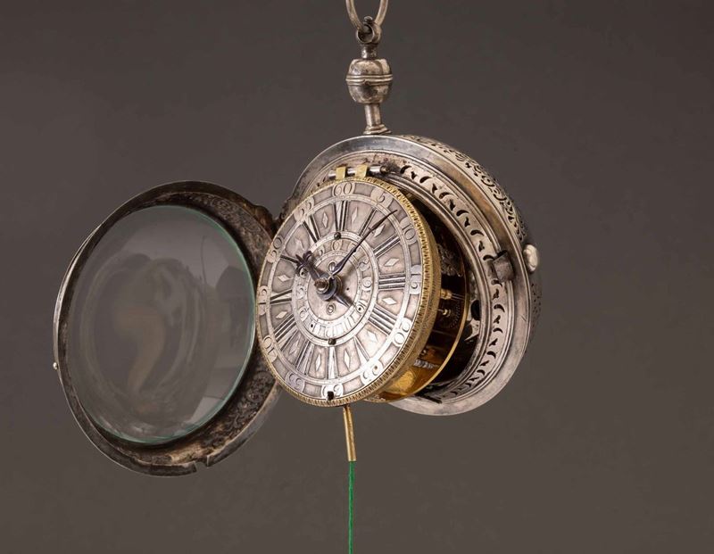 Eccezionale orologio da carrozza in doppia cassa : cassa interna in argento traforato, cassa esterna ricoperta di pelle: diametro esterno 123 mm, diametro cassa interna 108 mm. Quadranti in argento inciso.