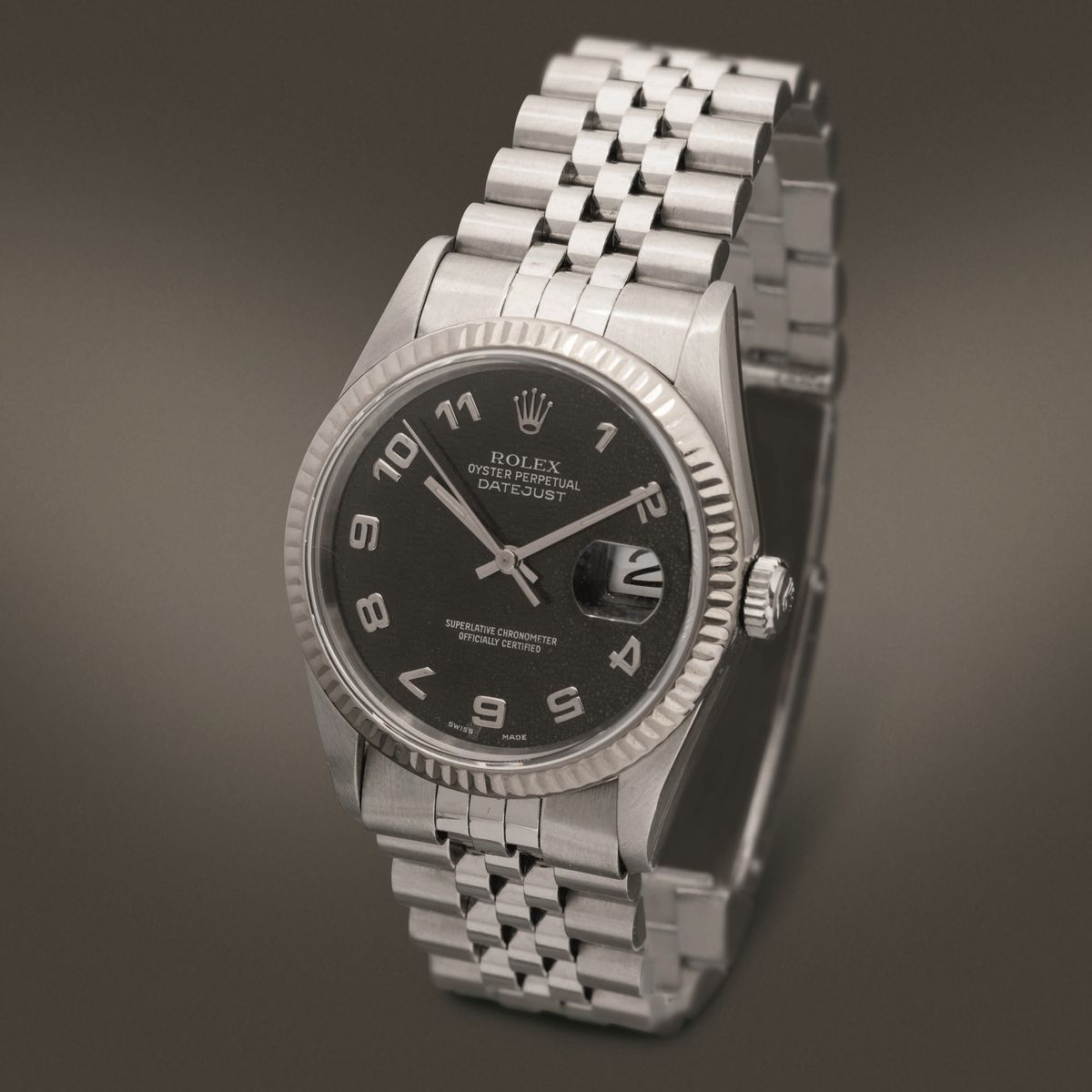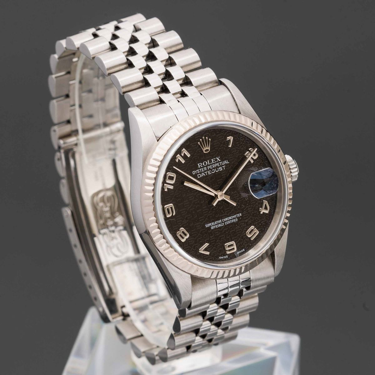 ROLEX - Datejust ref 16234 in acciaio, movimento automatico con datario, lunetta in oro bianco zigrinata e quadrante Jubi [..]