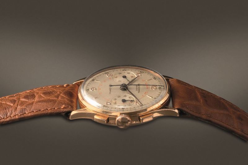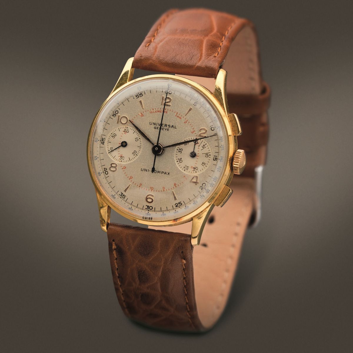 UNIVERSAL GENEVE - Uni Compax cronografo in oro 18k, carica manuale due contatori con scala tachimetrica e telemetrica