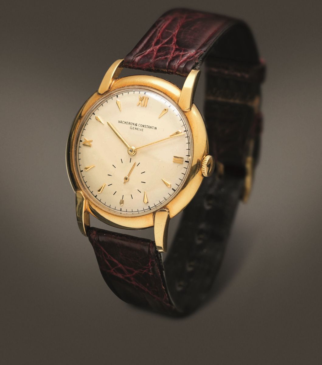 VACHERON & CONSTANTIN - Orologio oversize con anse riportate in oro giallo 18k, carica manuale, quadrante Argentè con numeri Romani applicati e piccoli secondi