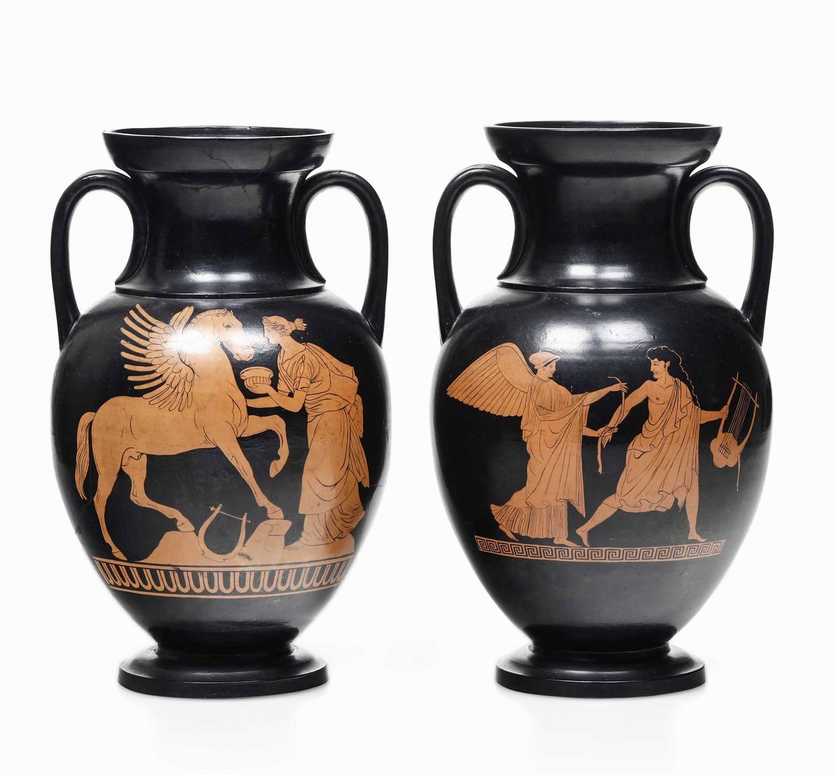 Terraglia decorata a figure rosse su fondo nero. Marca: coppia di pesci impressi. Altezza cm 30,5 circa. Conservazione: un vaso in ottimo stato, l'altro rotto in più frammenti e ricomposto in restauro