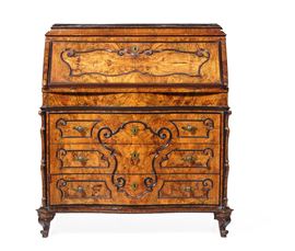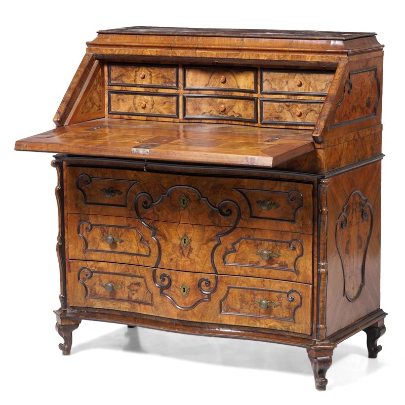 Fronte di forma mossa a tre cassetti e anta ribaltabile, cornicette in rilievo ed ebanizzate, piedi a ricciolo