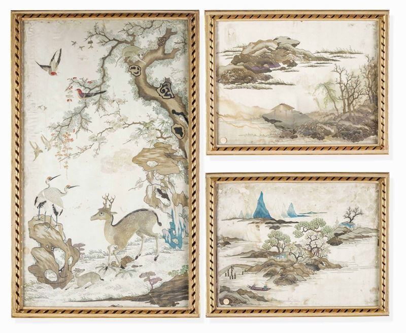 Serie di tre dipinti con paesaggi in tecnica mista. Cina, XIX-XX secolo