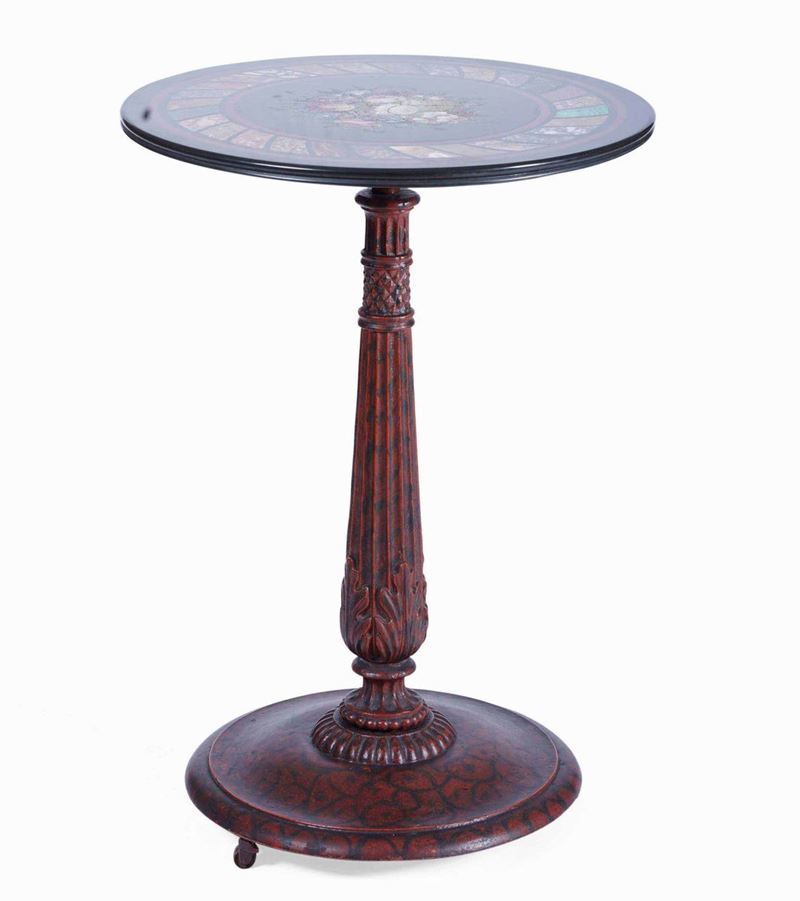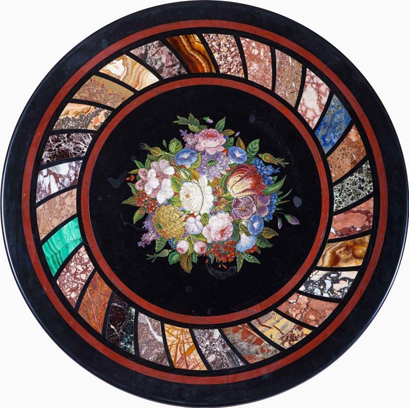 Tavolino con piano a commesso di marmi e pietre dure centrato da micromosaico floreale. XX secolo