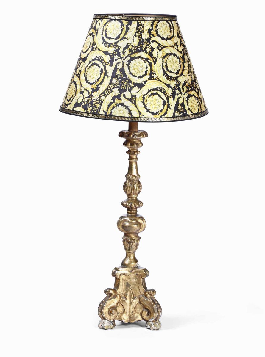 Torciera in legno intagliato e dorato con paralume in stoffa Versace
