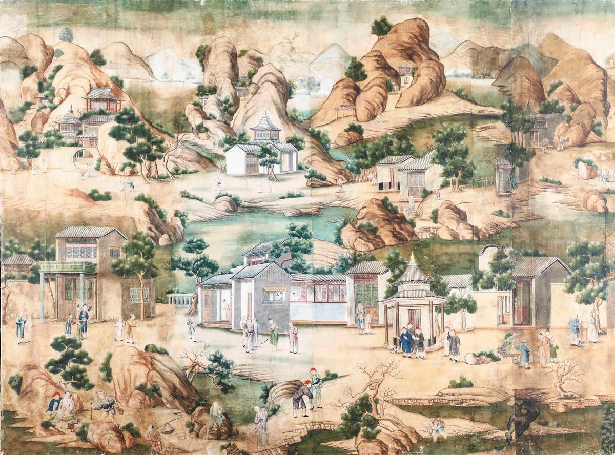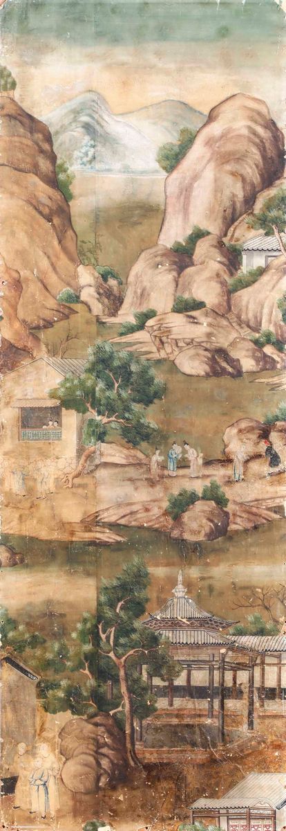 Tre grandi dipinti su carta raffiguranti paesaggio con scene di vita comune, Cina, Dinastia Qing, epoca Qianlong (1736-17 [..]