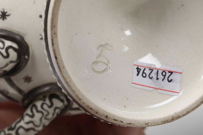 Terraglia decorata in policromia. Marca: "G" incisa sotto al vaso. Altezza totale cm 32,5. Conservazione: buona; restauro al bordo superiore del vaso