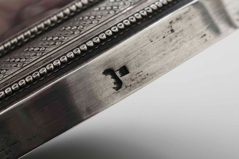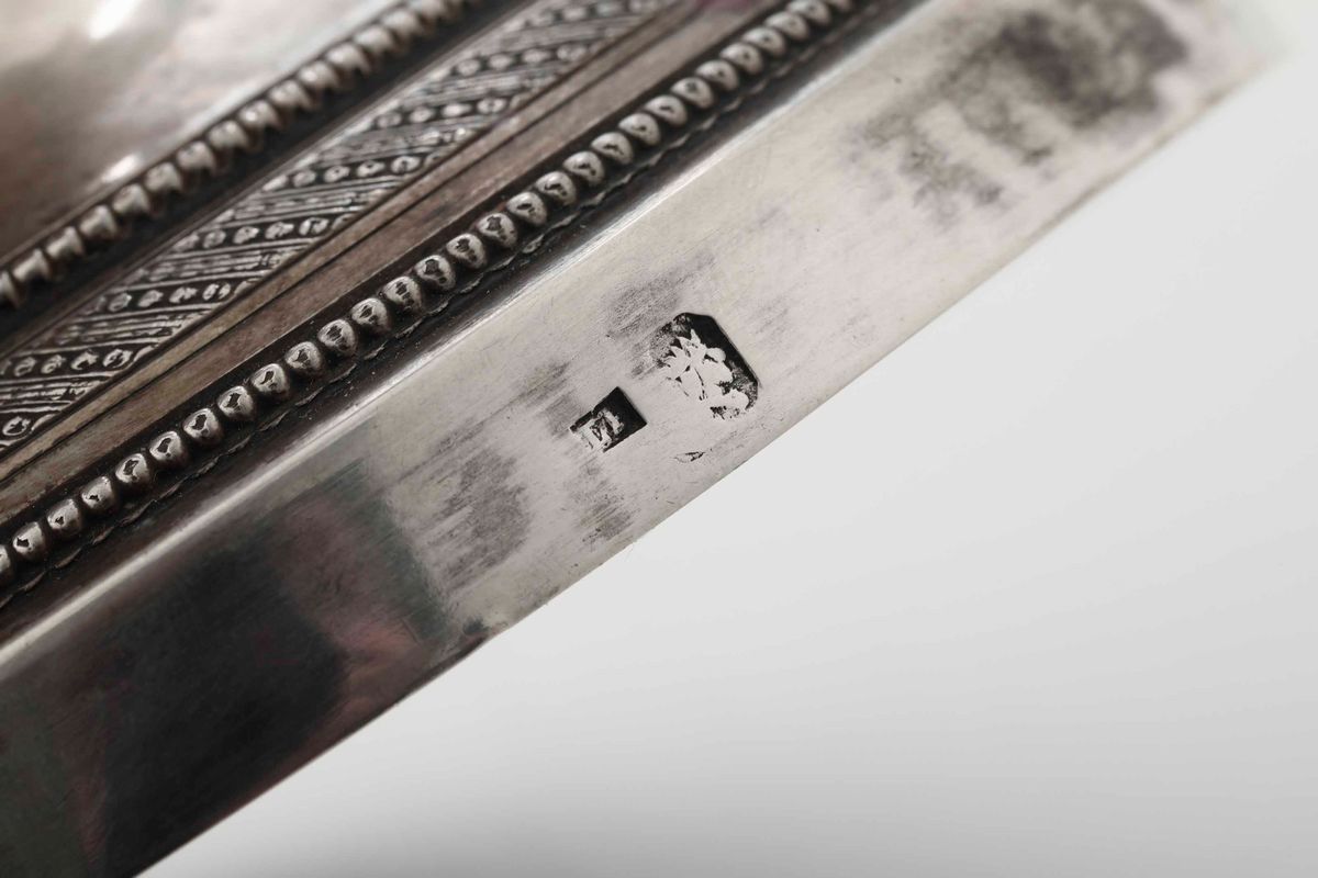Coppia di candelabri. Argento fuso, sbalzato e cesellato. Svezia, Stoccolma, prima metà del XIX secolo, argentiere LP