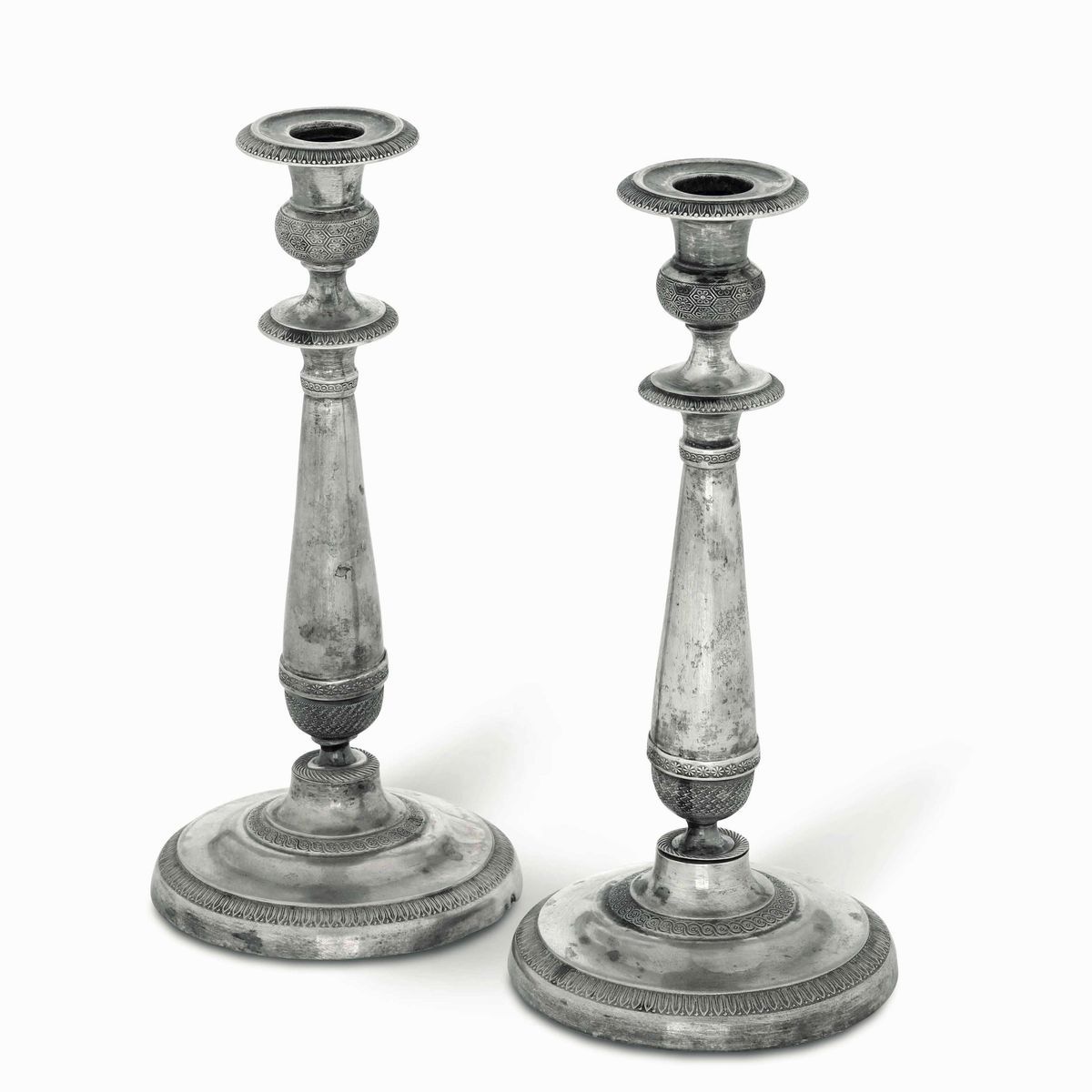 Coppia di candelieri. Argento fuso e sagomato. Genova XIX secolo. Marchi con croce mauriziana e delfino in uso dal 1824 al 1879