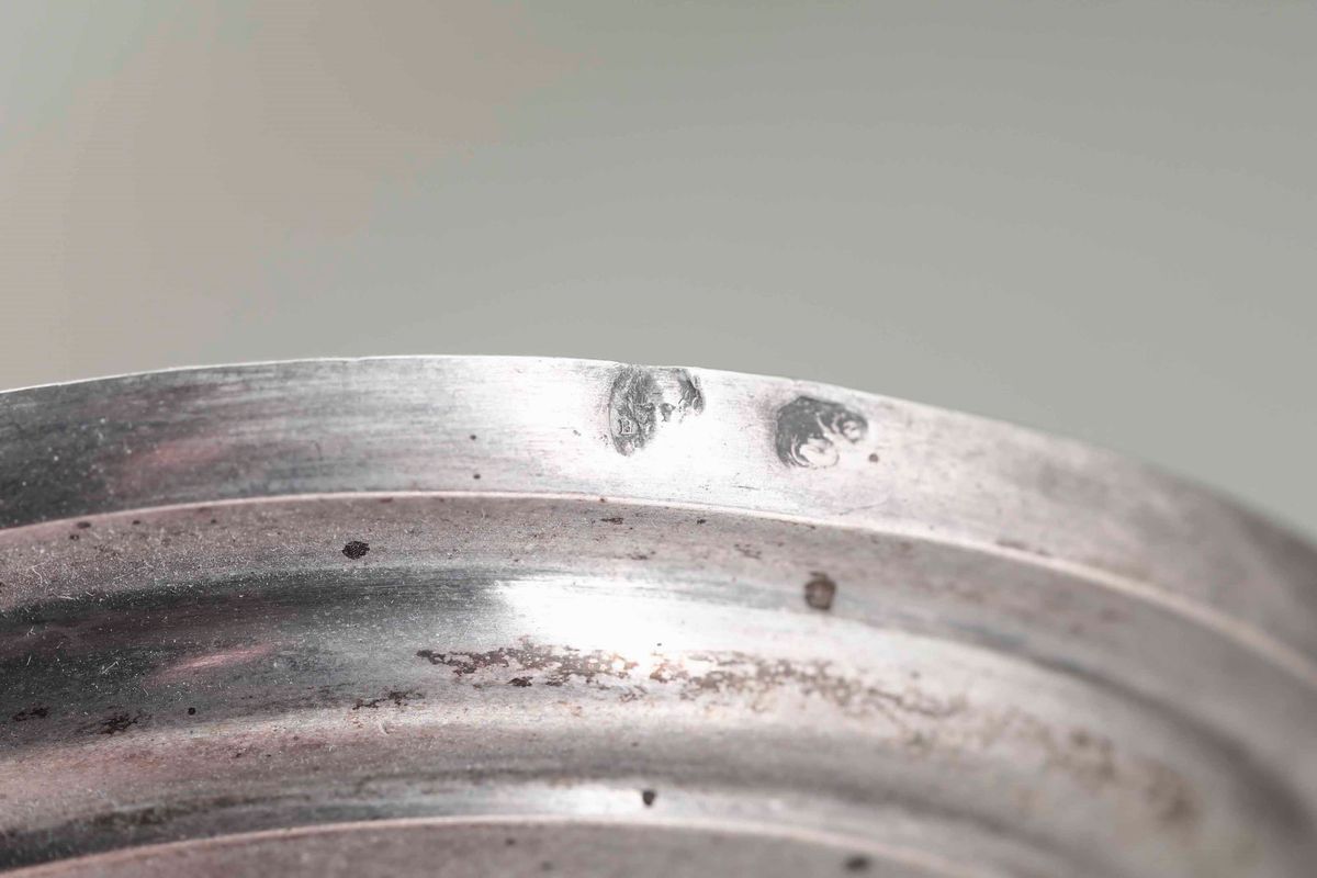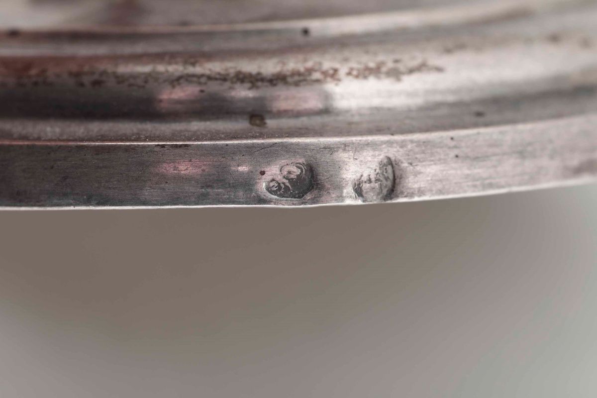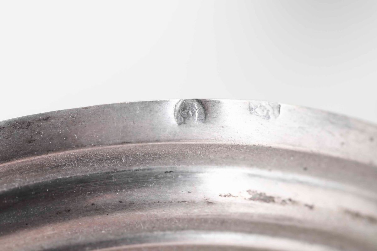 Coppia di candelieri. Argento fuso e sbalzato. Italia inizi XIX secolo. Genova (?) marchi di occupazione francese in uso dal 1803 al 1809